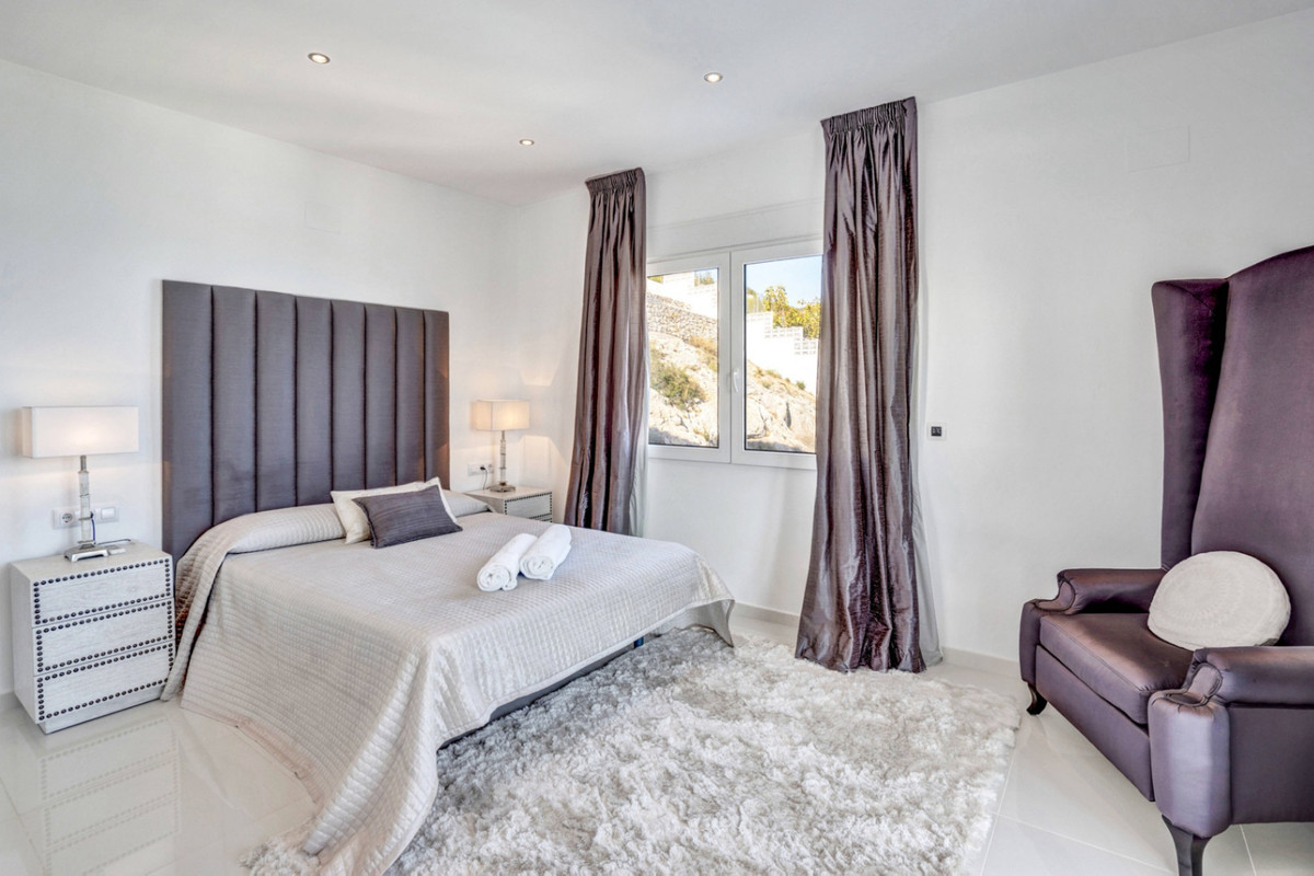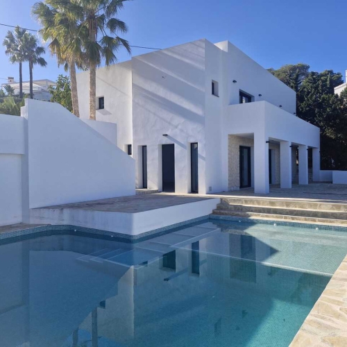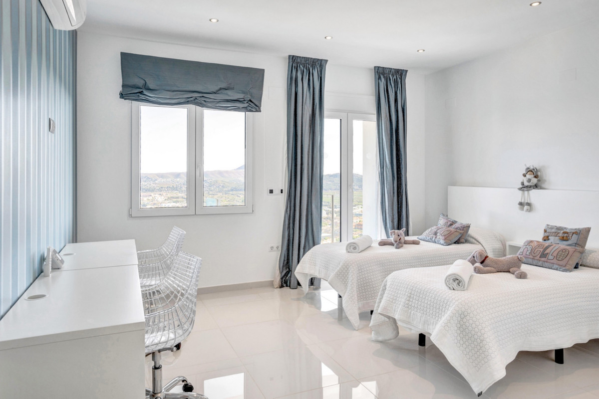 Modern and spacious villa of 795 m2 sitting on a plot of 1760 m2, with spectacular sea and mountain views, located in the popular area of La Corona, overlooking the Port of Jávea. Boasting 2 swimming pools, heated indoor and outdoor swimming pool, a fully equipped cinema, bar/games room, a yoga/stretch area, two saunas and a jacuzzi overlooking the Mediterranean sea.