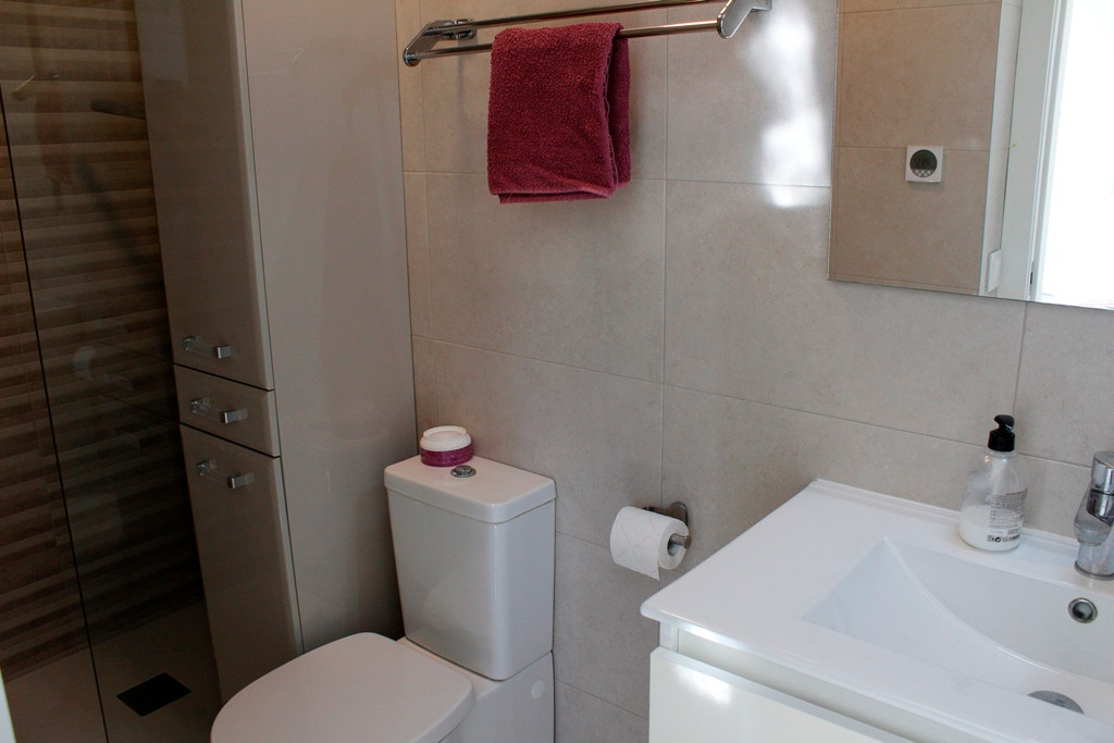 The house is oriented south-east and benefits from plenty of natural daylight thanks to the open spaces and large windows. The villa has a beautiful spacious open plan living and dining area and comprises of a bright lounge/dining room with a fully-fitted kitchen with quality appliances, a bedroom with ensuite bathroom downstairs, 2 bedrooms with two ensuite bathrooms with shower and a terrace with nice open views upstairs.