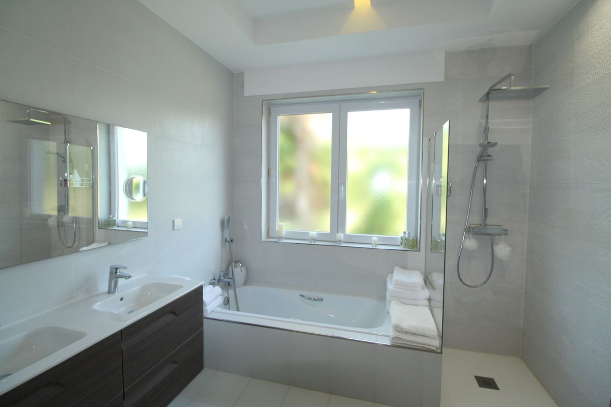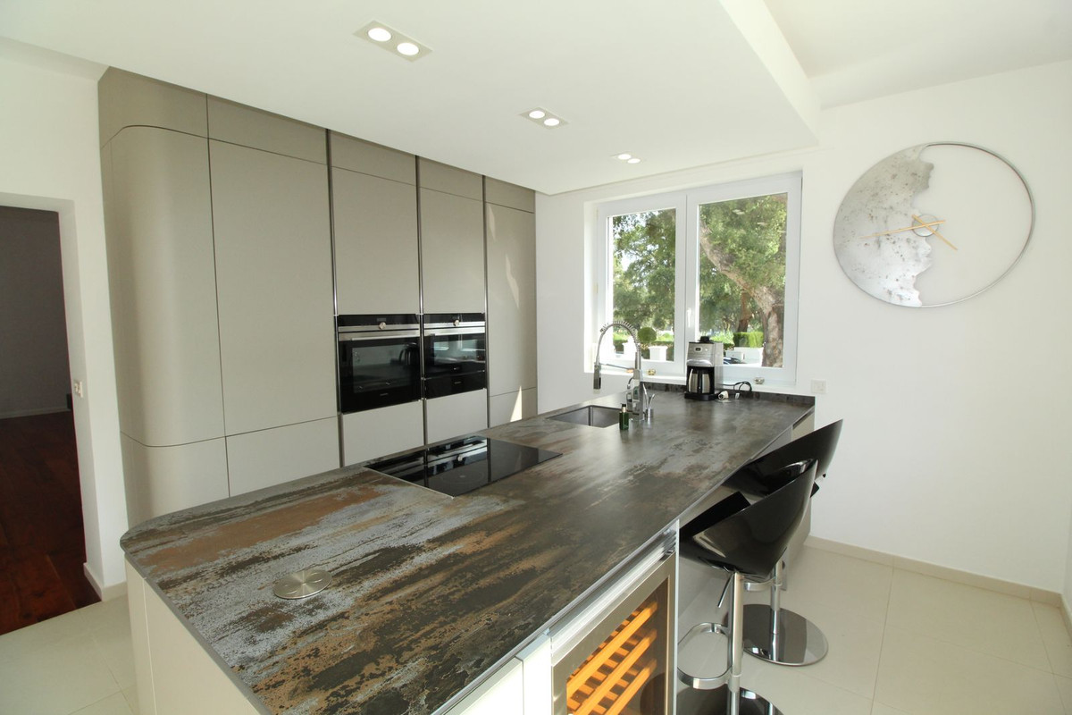 The ground floor of the villa presents two en suite bedrooms, each exuding opulence and comfort. The main living area is a true embodiment of luxury living, featuring an open-plan layout with a beautiful kitchen, a dining area, and a cozy TV area for relaxation. From the second living room, you can access a covered terrace, providing a seamless transition between indoor and outdoor living spaces.
