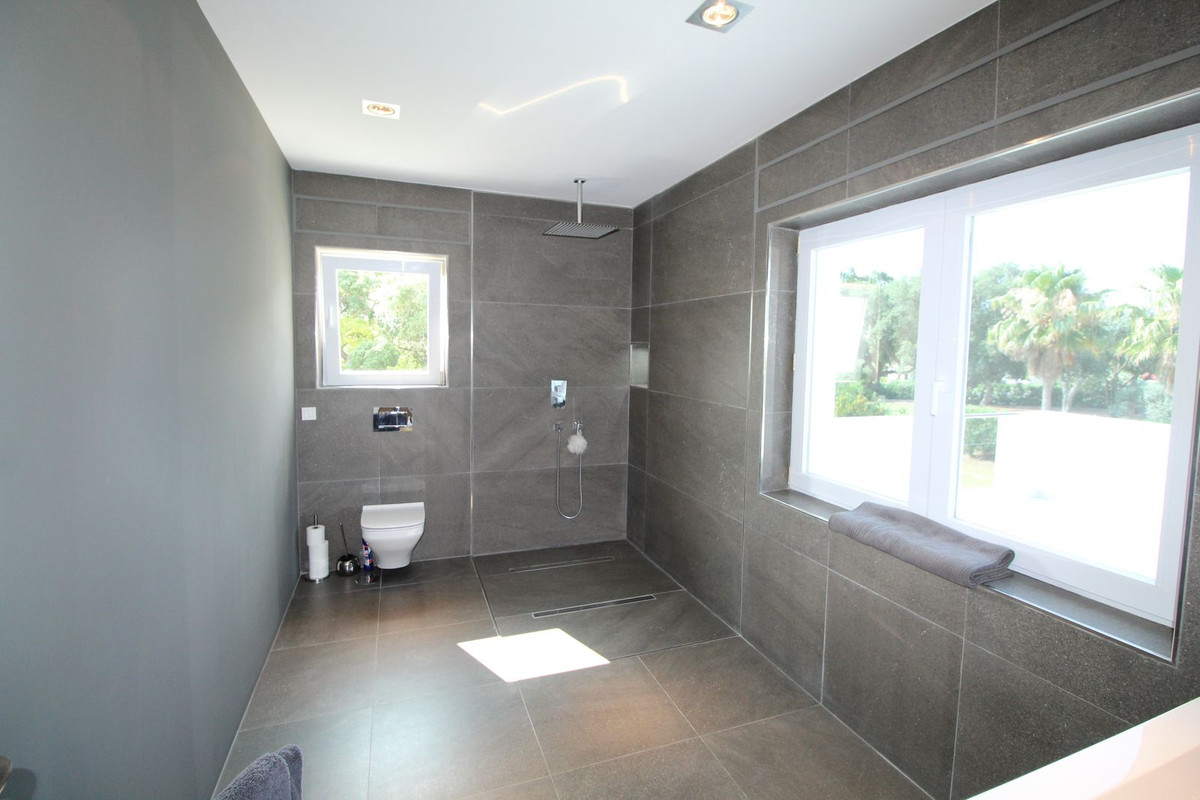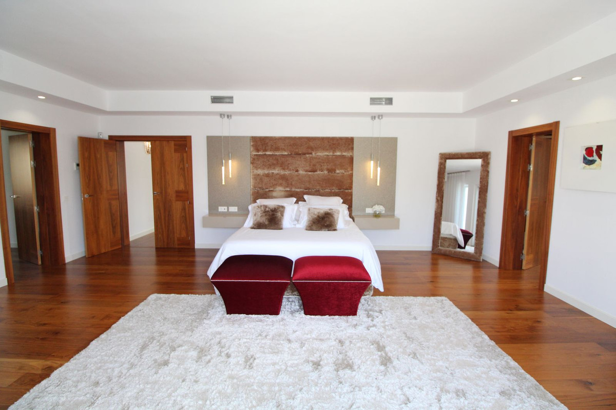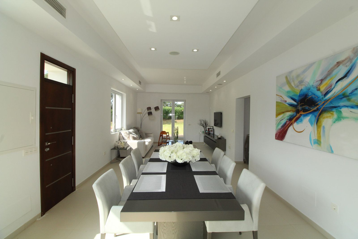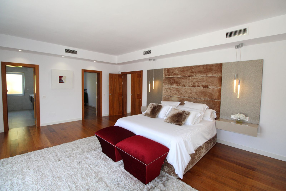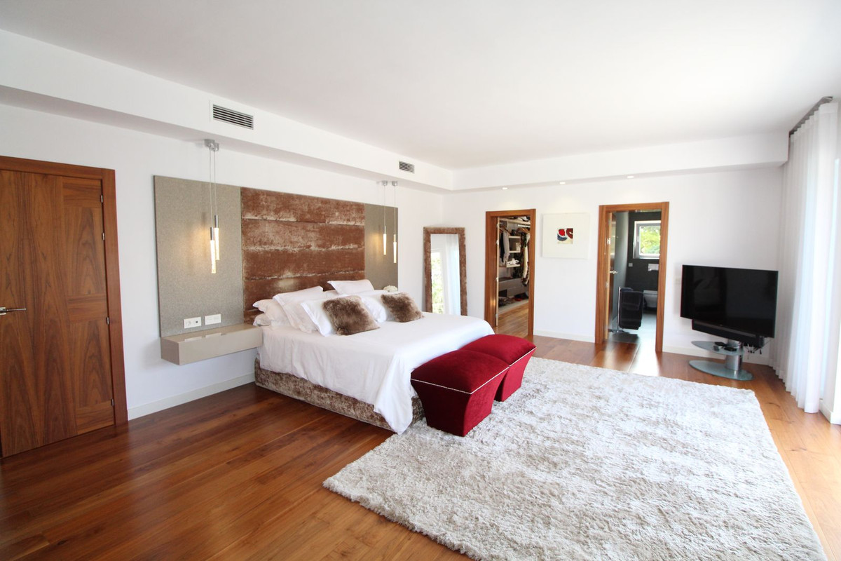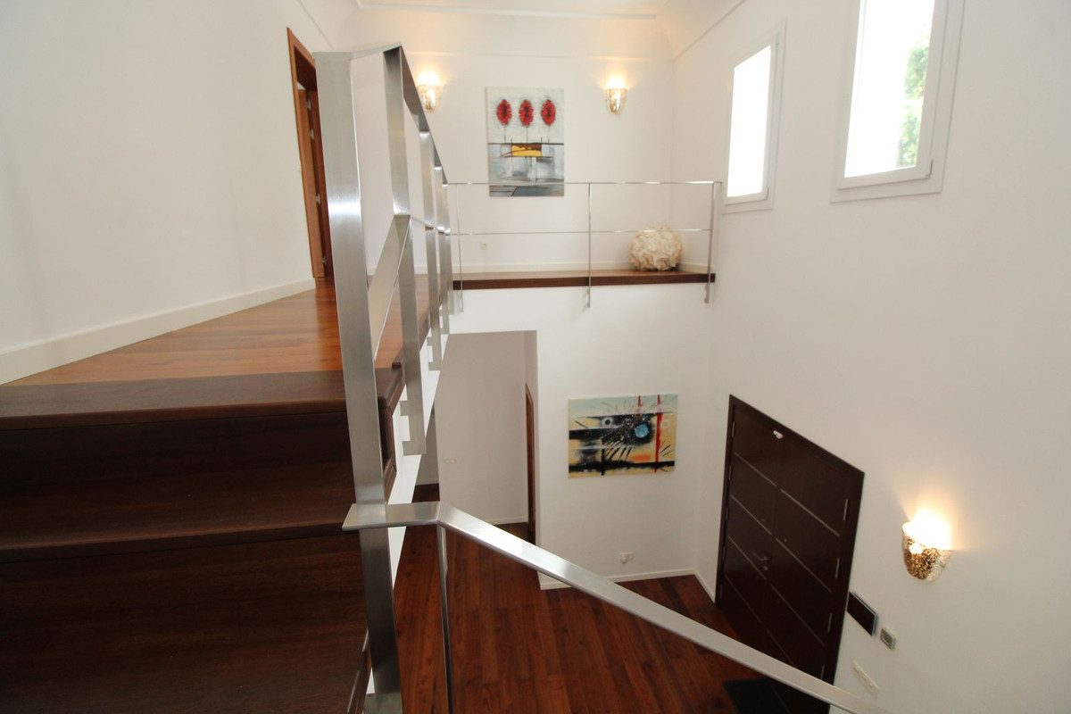 As you step inside, you are greeted by an elegant entrance room, adorned with a magnificent wooden staircase that serves as a centerpiece. The villa features a grandiose master bedroom on the top floor, complete with two bathrooms, a spacious dressing room, and an additional room perfect for a study. The master bedroom offers the added allure of wooden flooring and grants access to a large terrace overlooking the picturesque garden and golf course.