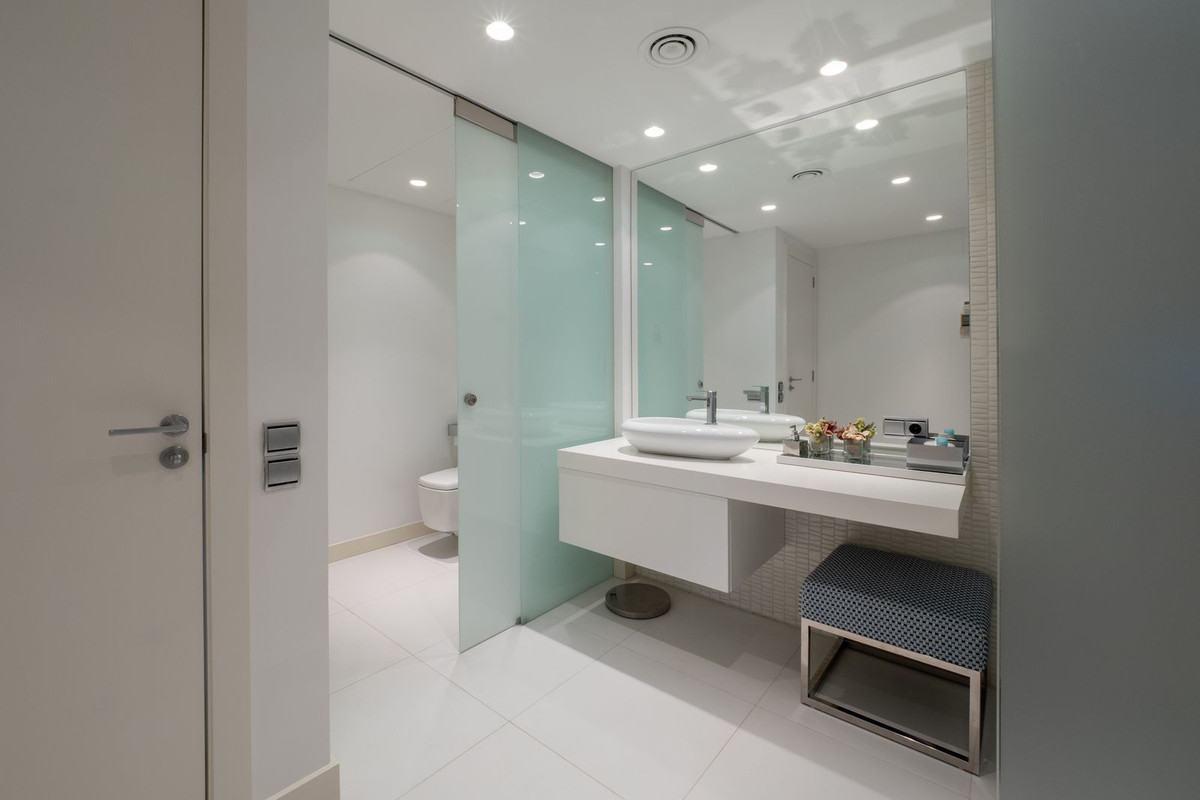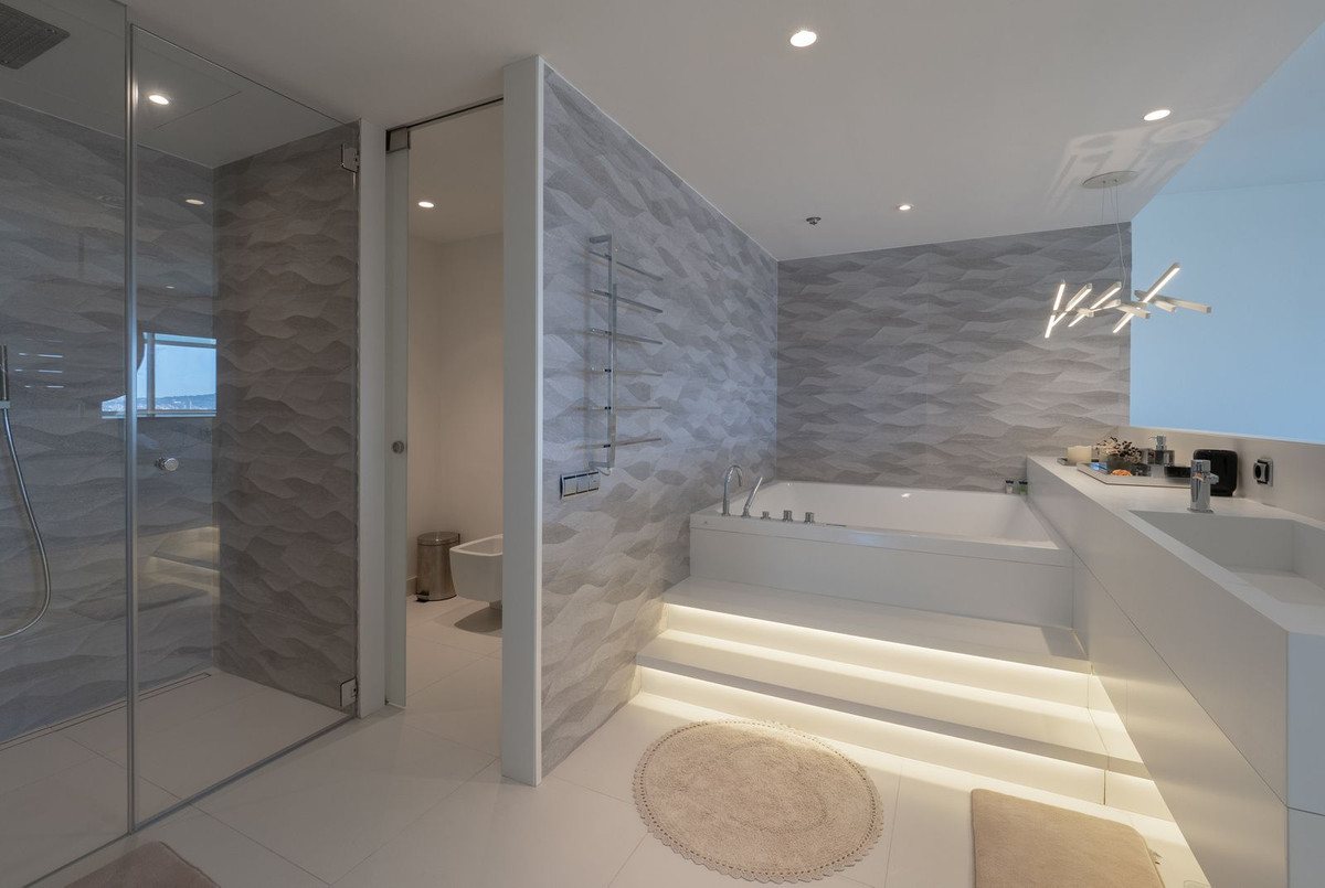 On the lower level, the first bedroom offers ample space and privacy, accompanied by a sleek, modern bathroom that features high-end finishes for a spa-like experience. Upstairs, a versatile multifunctional space leads to the master suite, which includes an open-concept bathroom with both a shower and a hydromassage tub, perfect for unwinding after a long day.