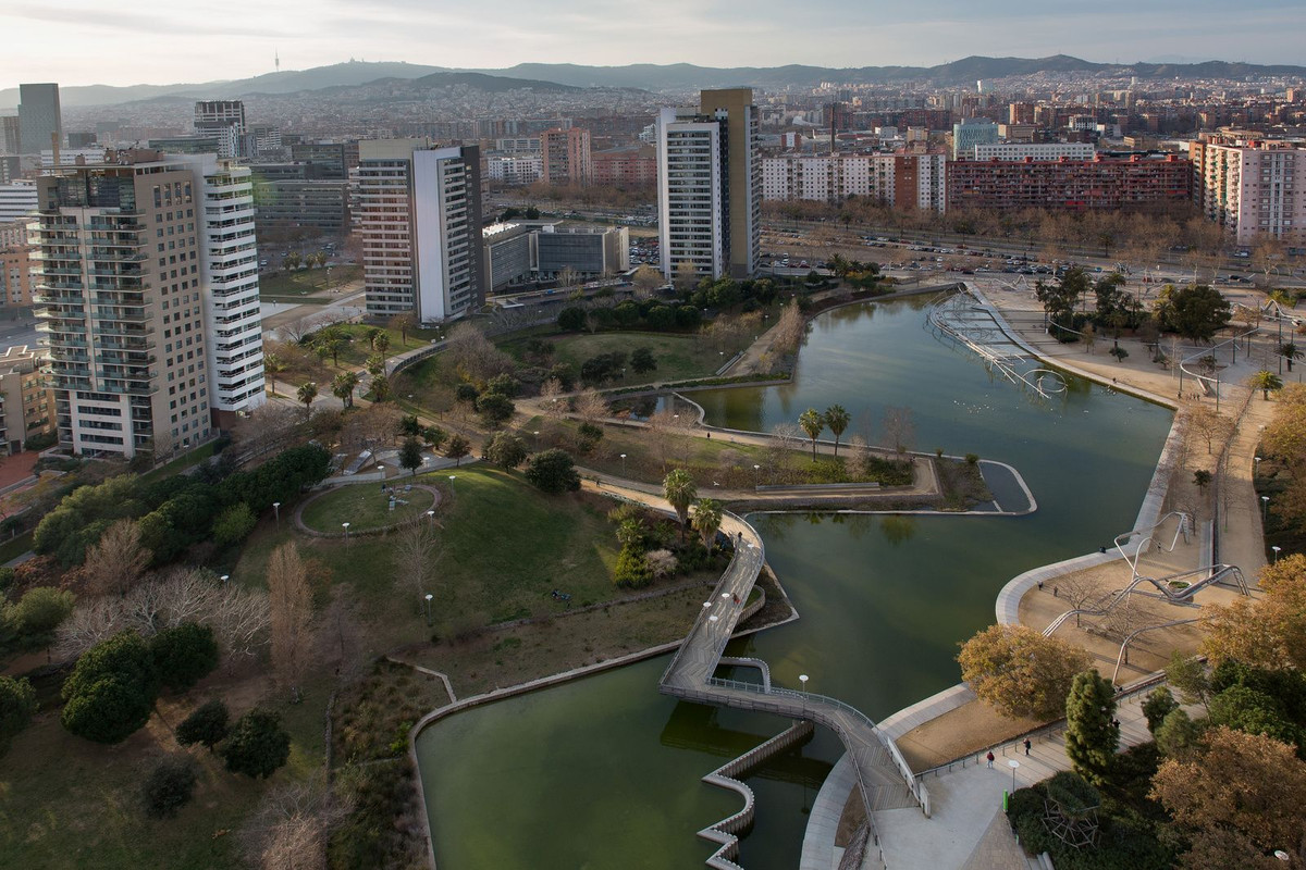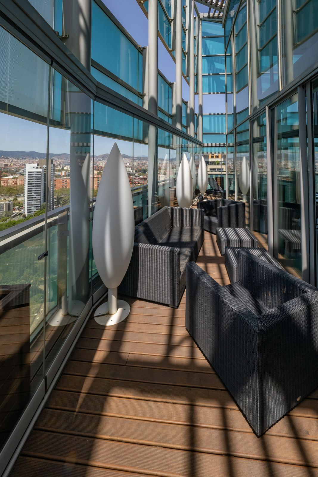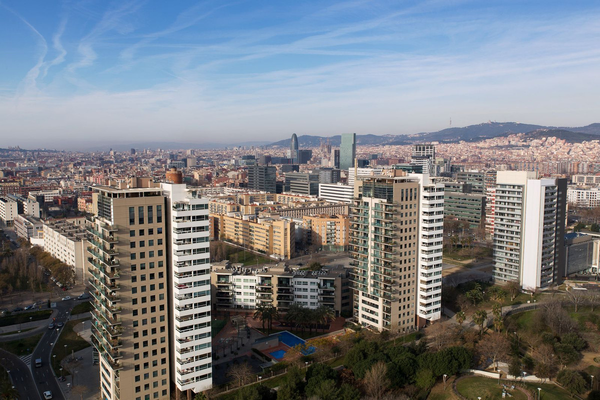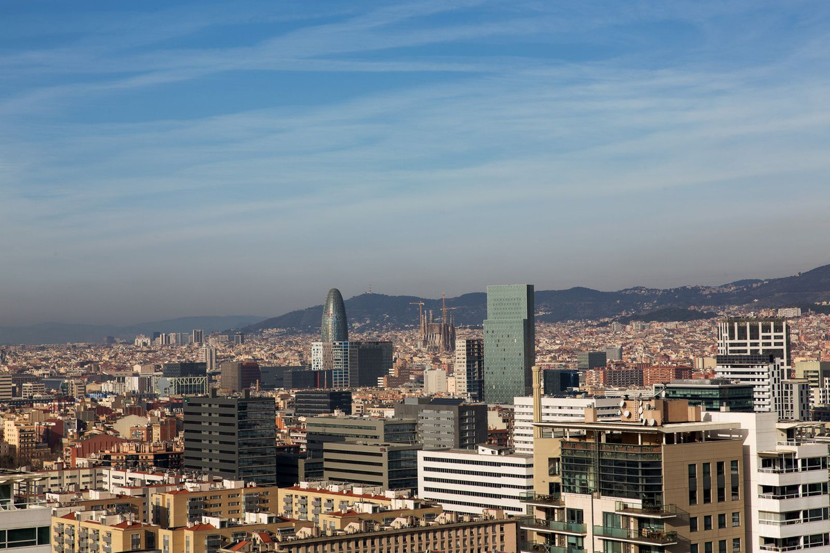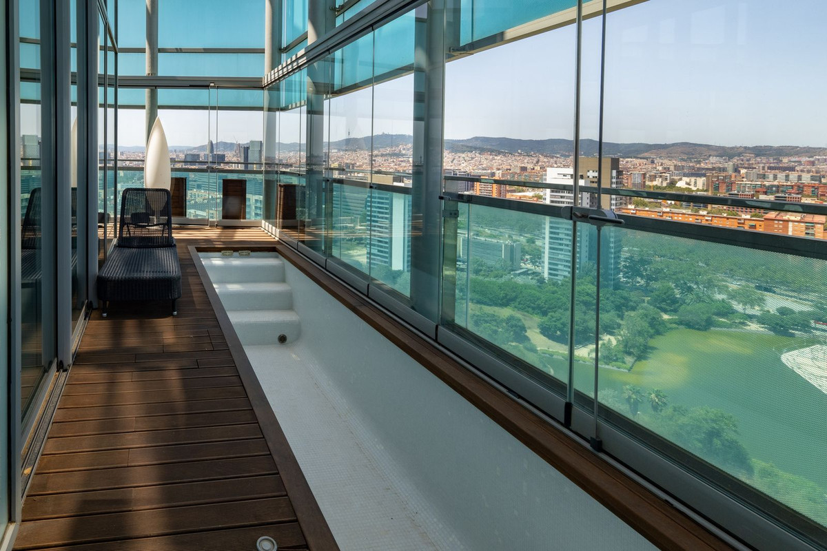 The spacious living area boasts floor-to-ceiling windows, framing panoramic views of Barcelona's cityscape and coastline. These expansive windows invite the sunlight to flood every corner of the home, while also providing direct access to a private terrace, complete with your own luxurious pool—the perfect spot to relax or entertain while taking in the serene surroundings.
