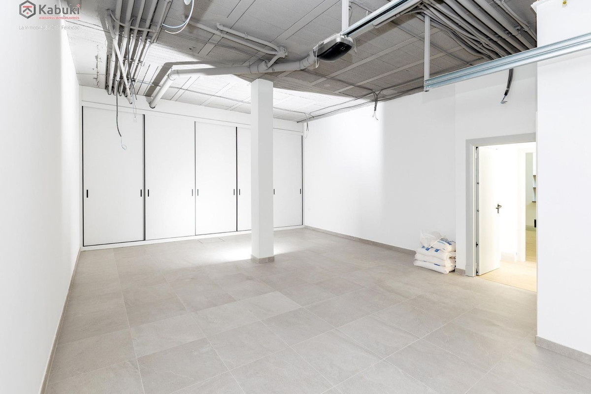 The ground floor has two independent accesses. The first leads to a spacious parking area with capacity for two vehicles, and the second is a pedestrian entrance, where there is a large room. Both rooms feature ample storage cabinets and a guest toilet.