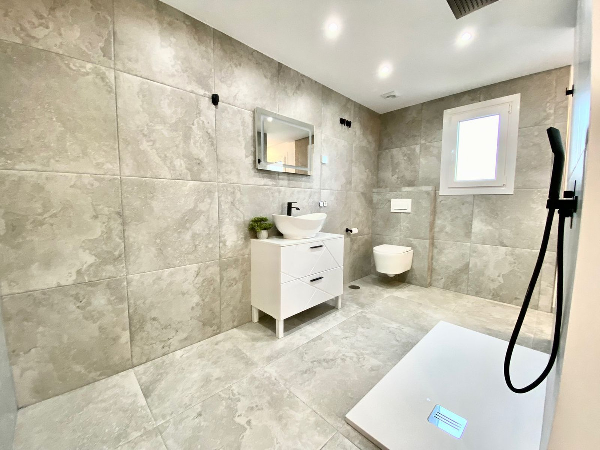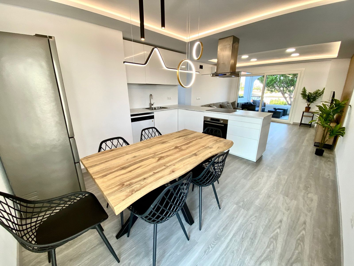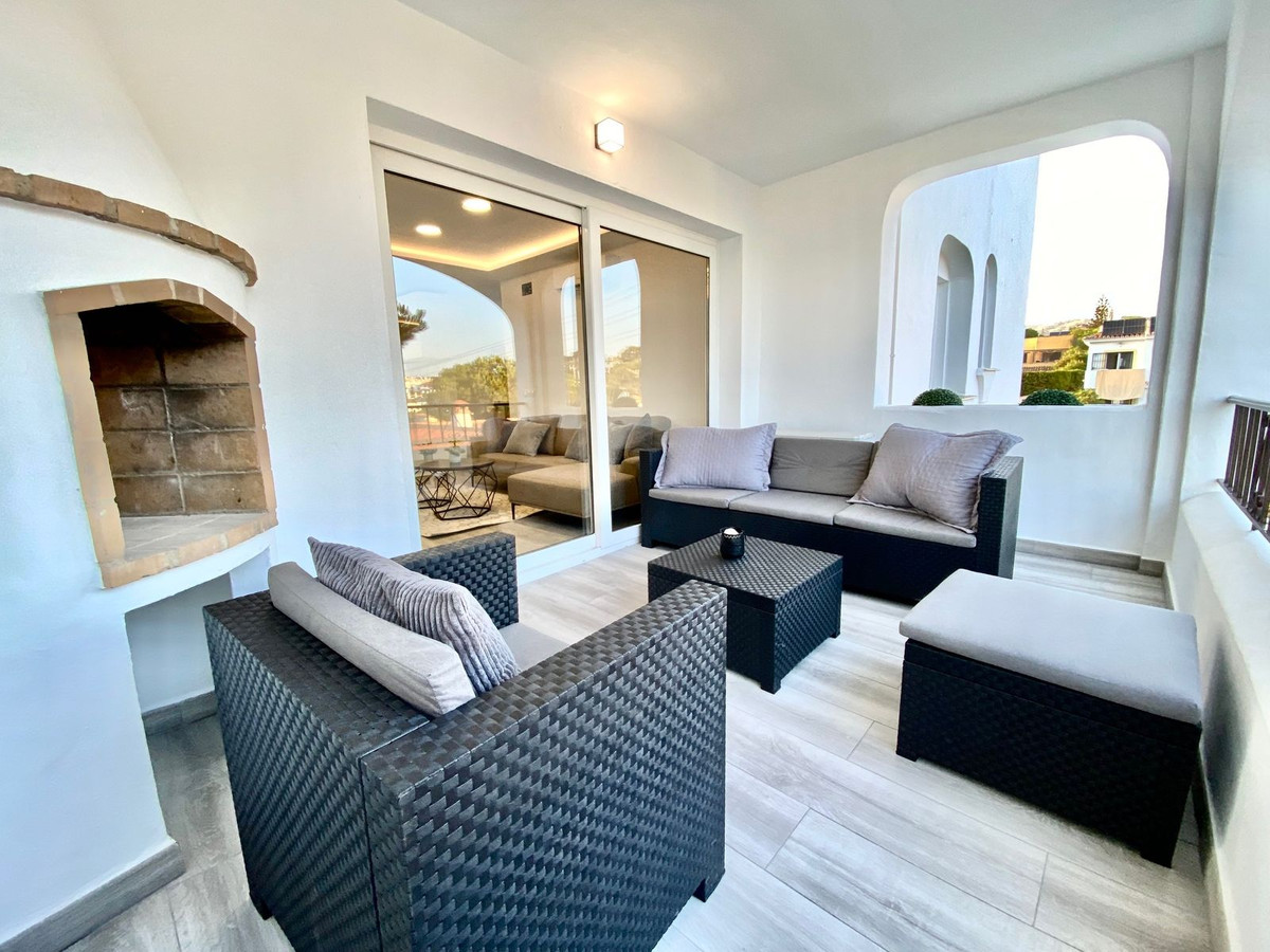 Apartment that has just been renovated with new furniture has 3 bedrooms, 2 of them with sea views, 2 bathrooms, one en-suite, living room with open kitchen that faces the kitchen part to the west with views of the sea, garden and pool and Another part where this terrace with barbecue faces east with views of the sea as well.