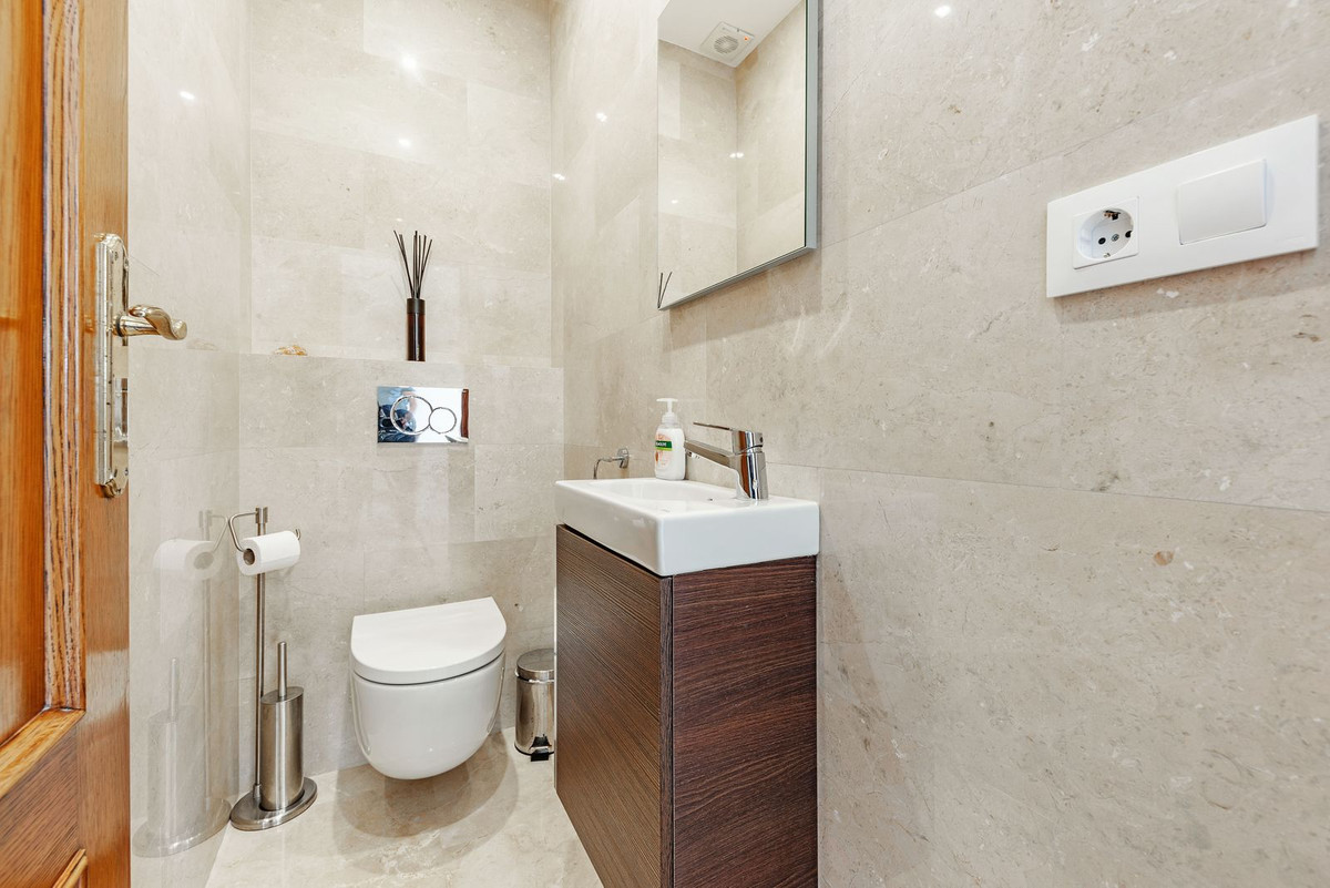 Main Floor: Upon entry, a grand foyer opens to a spacious living room, complemented by an equally elegant dining area and a fully equipped kitchen with an adjacent laundry room. The main hall, with its intricate carved wooden staircase, also leads to a guest bathroom. On this level, there is a private apartment with its own independent entrance—ideal for guests or use as a rental suite. This apartment includes a chic living-dining area, kitchen, master bedroom with an en-suite bathroom, sauna, and a private terrace boasting serene mountain views.