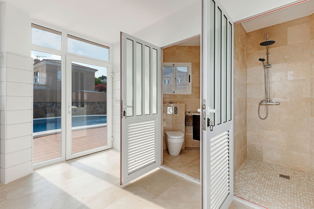 Exteriors: The outdoor living spaces are a true highlight of the villa, with several expansive terraces perfect for al fresco dining or lounging by the 45 m² pool, which enjoys direct views of the Mediterranean Sea. A fully equipped pool house, complete with a kitchen, shower, and toilet, ensures effortless outdoor entertaining.