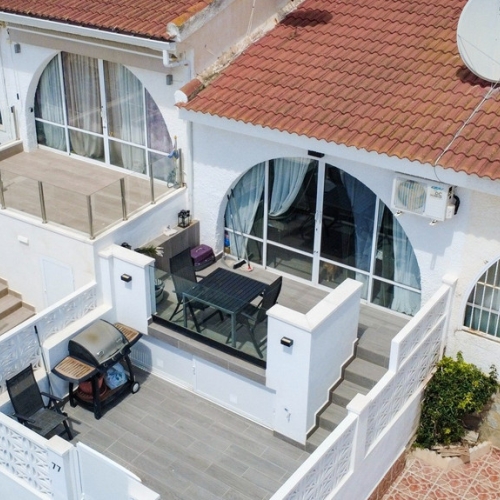 Ciudad Quesada, Doña Pepa, luxury top floor bungalow with 2 bedrooms and 2 bathrooms, 80 m2, with solarium (73m2) with views to the salt lakes, open plan kitchen, living room with fireplace, jacuzzi, summer kitchen, air conditioning, storage room, terrace, sold equipped and furnished.