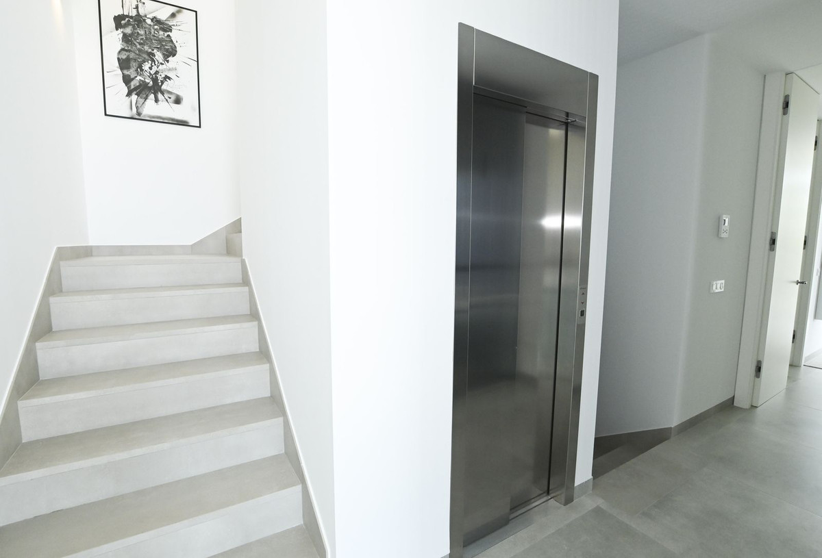 1) Second floor: entrance, staircase and elevator access. In addition, on this floor, there is a driveway outside with a covered parking space for two cars and an additional terrace with a sail.