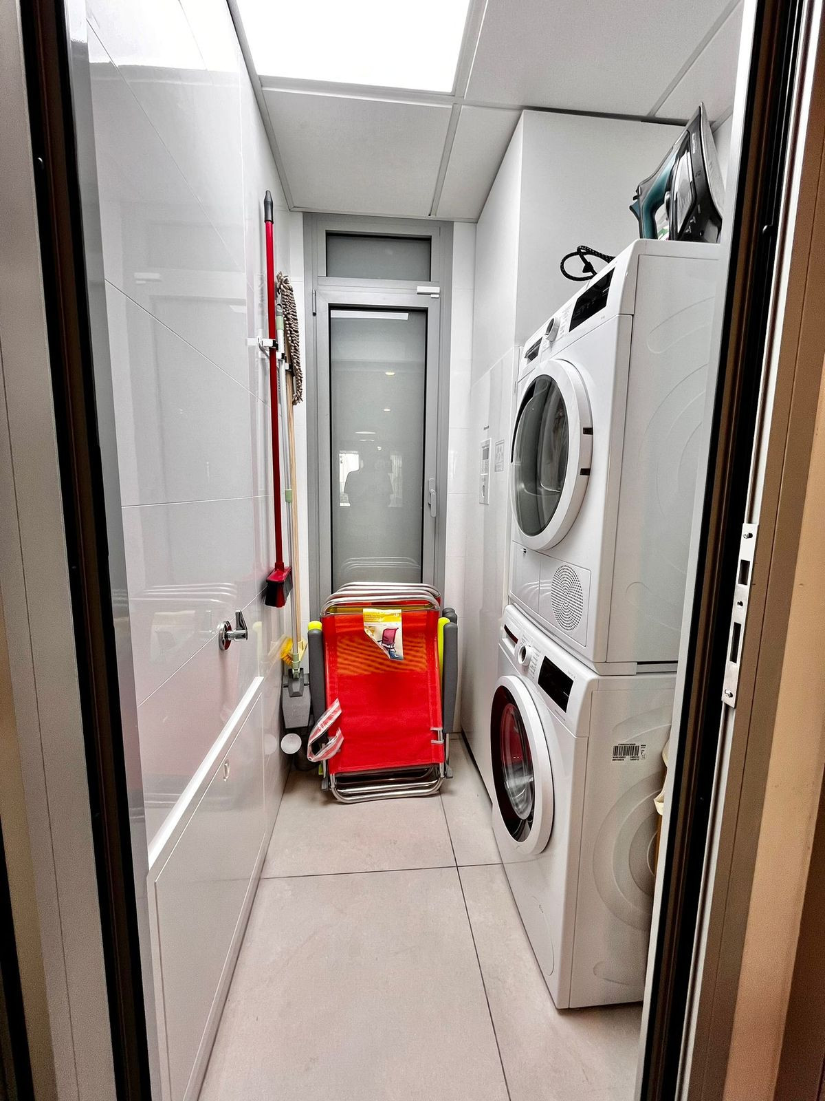 The apartment is equipped with a living room with access to the terrace and garden with a dining room and an open fully equipped kitchen and utility room, where there is a washing machine and dryer.