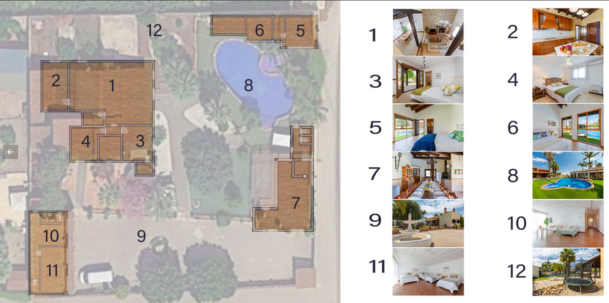 Total Living Space: 500 m² within a 5000 m² landscaped plot. Bedrooms Bathrooms: 7 bedrooms and 7 bathrooms (including 3 en suites), accommodating up to 18 guests. Luxury Amenities: Private pool, 200 m² of terracing, barbeque area, satellite TV in multiple languages, Wi-Fi, air conditioning, and heating. Parking: Covered space for 5 cars and additional outdoor space.