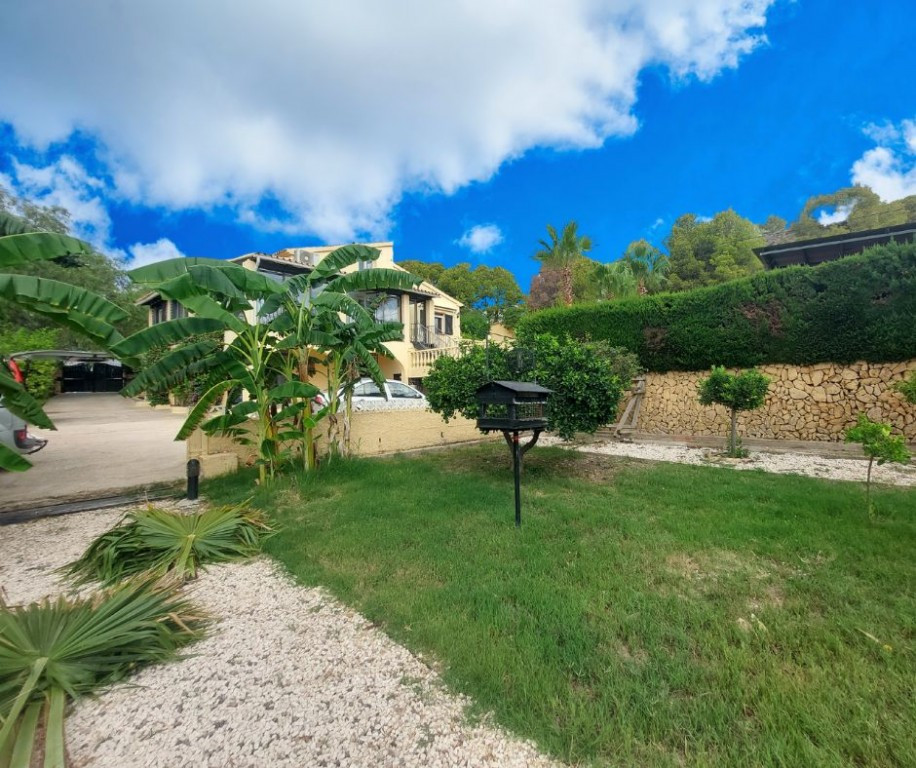The main house is spread over two spacious floors. The grand entrance opens into a spacious dining room, perfect for entertaining guests, and leads to a fully equipped separate kitchen designed for culinary excellence. The highlight of the main floor is the expansive living room, filled with natural light and offering breathtaking views of Altea's landmarks, the glistening sea, majestic mountains, and surrounding nature. This room extends to a large terrace, an ideal spot for savoring the scenic beauty, with steps leading down to the manicured courtyard.