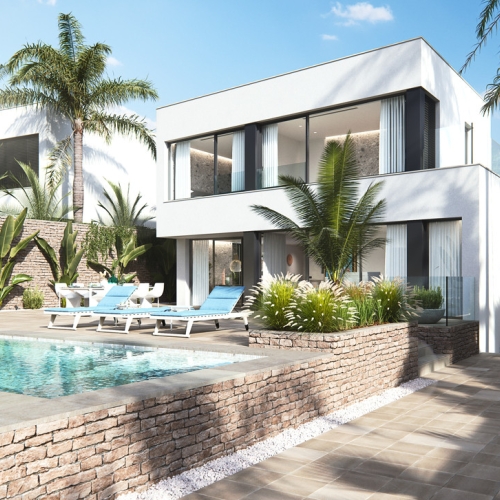 These villas have 3 bedrooms and 3 fitted bathrooms. Designed with a contemporary style and open planned concept, comprising a fully-fitted kitchen and lounge-dining room.