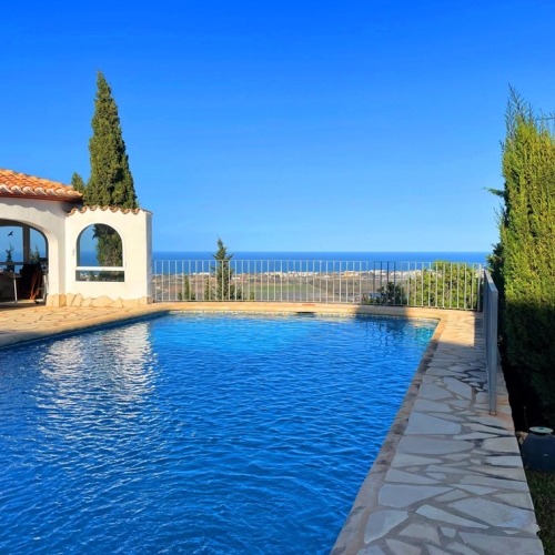 Impressive villa in one of the most quiet and pleasant areas of Denia, with stunning views of the Montgó Natural Park and sea views. The property is fully conditioned and ready to move in. The property consists of a fully furnished main house of 250m2 with gas central heating and air conditioning, with 4 bedrooms, the master bedroom with toilet, living room with fireplace, kitchen, shower room and a bathroom of about 30m2 with hydromassage cabin, a tower with a bedroom and bathroom, and a studio with shower room. There is a pool house with a kitchen, a shower room and a storage room. There is also a covered area with a barbecue, 2 benches and a table, and a garage with a pergola. It has a plot of 2700m2 with access from two streets, completely private and fenced with large well-kept gardens, a well, several terraces with greenery and a private pool. And best of all, on the plot there is the possibility of building another house of 200m2. It is located 1 km from Denia and 2 km from the sea. In total the villa has 6 bedrooms, 5 bathrooms, 2 kitchens.
