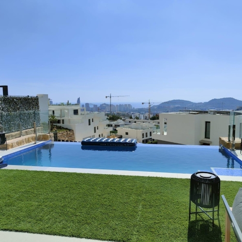 This beautiful villa is located in a nice, modern residential area 10 minutes from the center of Benidorm. At 5 minutes is a shopping center with several large supermarkets, all other amenities such as hospital, sports hall, golf, schools, beach, etc. can be reached in 10 minutes. It is located on a flat plot and surrounded by a beautiful landscaped garden. The villa consists of a spacious living-dining room with an open kitchen, a utility room, a guest toilet and 2 large double bedrooms each with an en suite bathroom. From the kitchen and living room you can access the poolside terrace through the large sliding windows. The terrace faces south-east so you can enjoy the sun here all day, there is also an awning to provide shade. There is also a large roof terrace with views of the skyline of Benidorm and the azure Mediterranean sea. The villa was built in 2019, but in the last few years a completely new high quality kitchen has been installed, also the 2 bathrooms have been renewed and have both received a walk-in shower. In addition, this property has extras, for example there are decorative elements placed against the wall outside that provide mood lighting at night, there is also a gazebo, an outdoor shower, a barbecue and a pergola. Both curtains and furniture are included in the price.