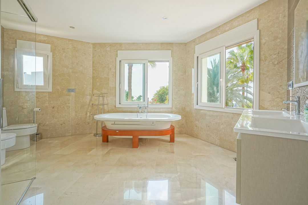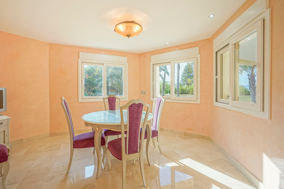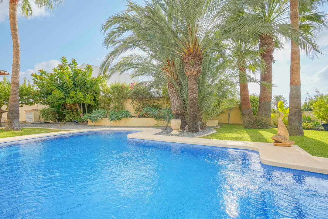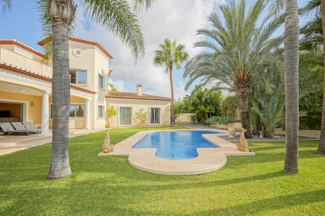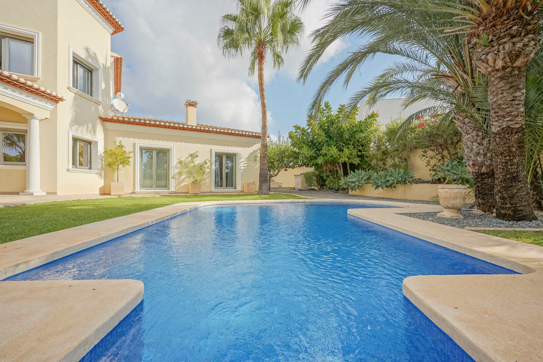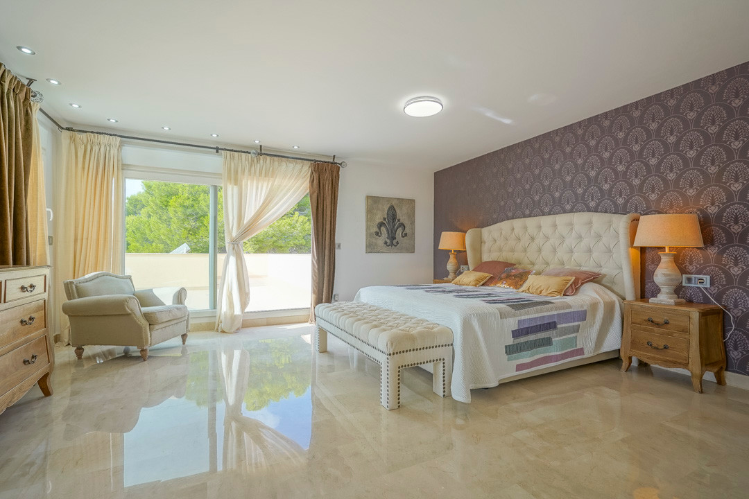 This traditional Spanish villa is located in a quiet area in Benissa a short distance from the coast. The ground floor comprises a spacious living-dining room, a fully equipped, modern kitchen and three double bedrooms, each with a private bathroom. The master bedroom is on the first floor and has a very spacious bathroom with sea views, a dressing room and a large terrace from where you can also enjoy the beautiful views of the Peñon de Ifach and the sea. Both the living room and all bedrooms on the ground floor have direct access through sliding windows to the spacious covered terrace. From the terrace you have views over the large swimming pool surrounded by a beautiful mature Mediterranean garden with several palm trees. On the other side of the villa is a large driveway with a carport and parking space for several cars. In the basement there is another laundry room and a storage room. The villa has underfloor heating, air conditioning, shutters, automatic irrigation and solar panels. In less than 5 minutes you reach the coast of Benissa where there are several idyllic beaches. In less than 10 minutes you reach the tourist port village of Moraira and in just 15 minutes you are in the lively seaside town of Calpe.
