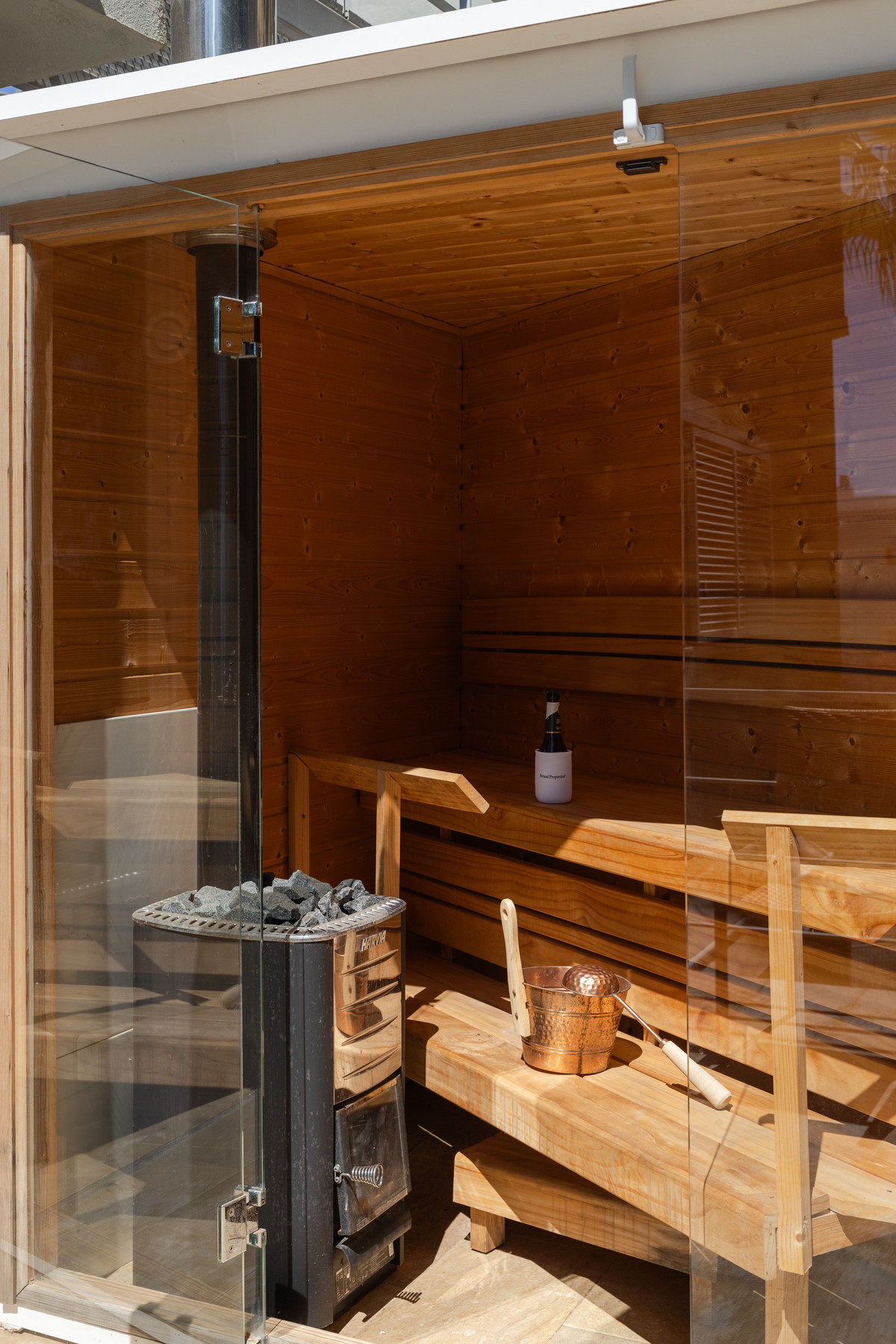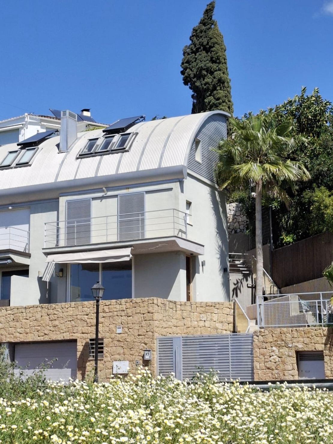 The house has four bedrooms, and its layout is designed to suit families, as the upstairs bedrooms are located close to each other. In this ready-to-move-in home, the interiors combine beautifully with the exteriors and terraces. The yard has its own plunge pool and a Finnish sauna, as well as direct access to the common infinity pool, which has wonderful panoramic views of the sea and the city.