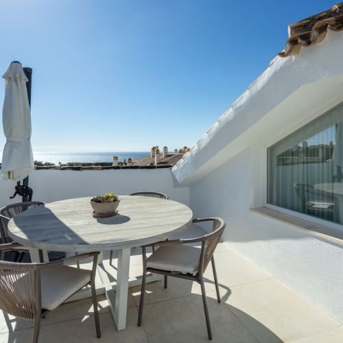 This is an immaculately presented penthouse in La Reserva de Marbella just minutes from Cabopino, Elviria and their lovely beaches. This penthouse has a large west facing terrace which offers great winter sun and sea views and upstairs is a huge roof terrace with its own enclosed room ideal for storage, gym or shaded lounge area. There is a large communal pool as well as garage space and storage room included in the price.