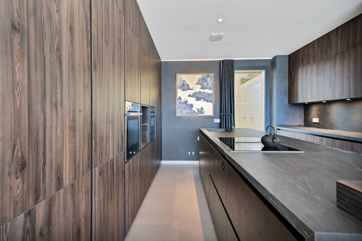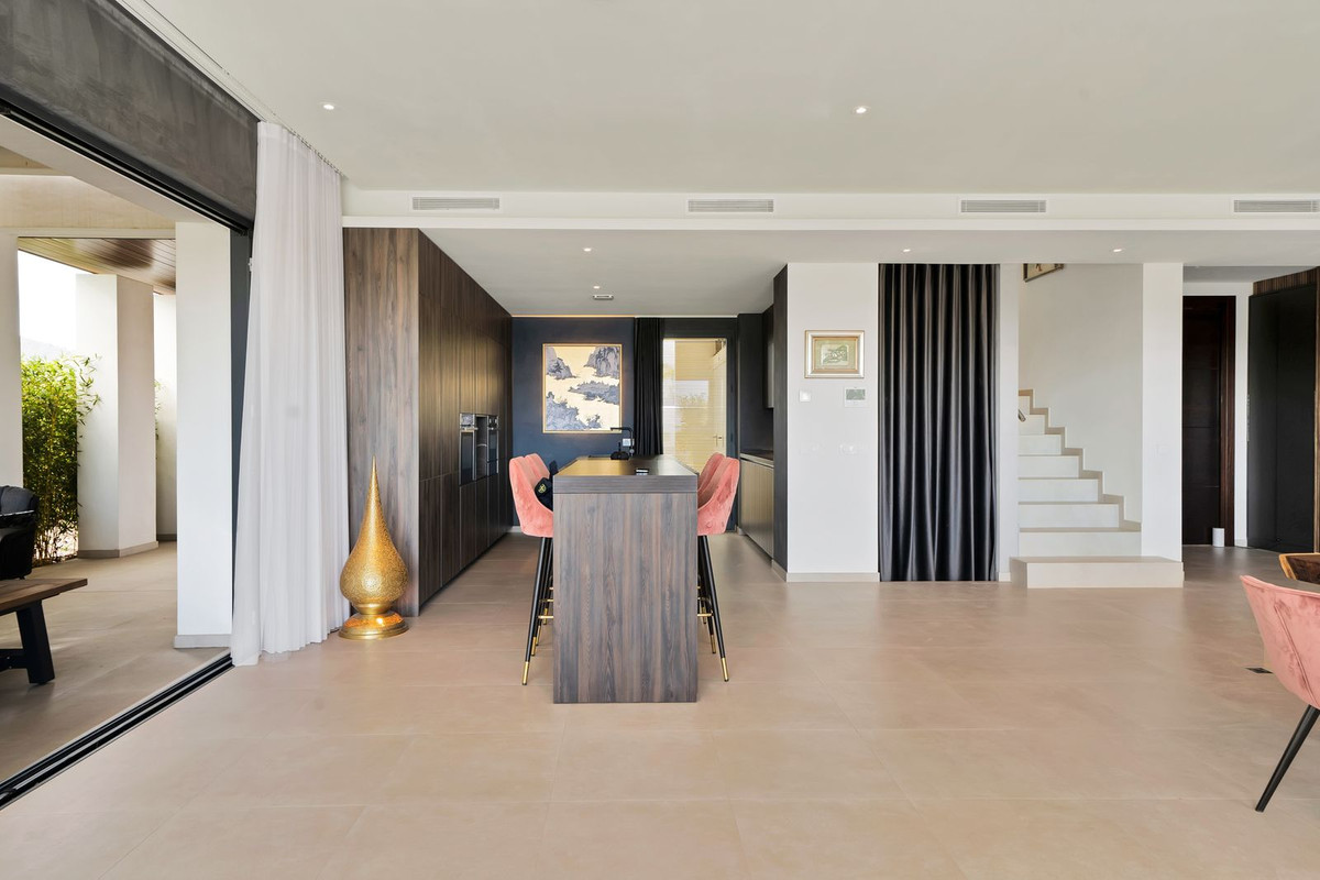 The heart of this stunning home is undoubtedly its open-plan living area, which seamlessly integrates the living, dining, and kitchen spaces into one cohesive and inviting environment. This area opens out onto large terraces, offering breathtaking views and creating an ideal setting for alfresco dining or simply enjoying the beautiful surroundings.