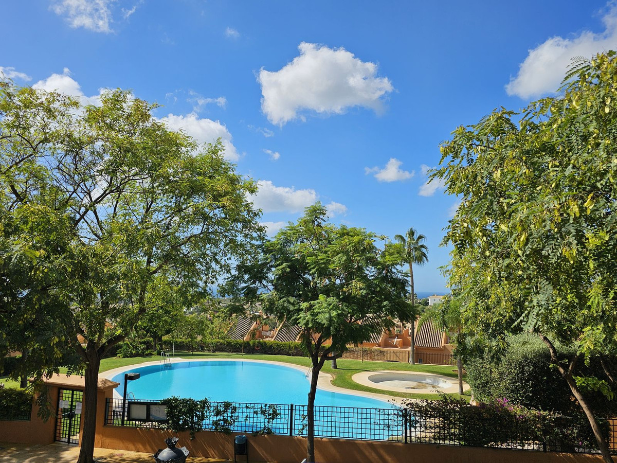 This fantastic 2 bedroom, 2 bathroom apartment is located in the popular area of Elviria, Marbella. Located in a front line golf development with 4 swimming pools, this property boasts fabulous open sea and mountain views and is just a few minutes drive from all amenities. Located in Los Lagos de Santa Maria, this first floor apartment has a large terrace with enough space for dining table, sofas and sun beds.The apartment comprises of 2 spacious bedrooms, 2 marble bathrooms (one ensuite), and a lovely bright sitting room/dining room that takes you straight onto the large terrace. The kitchen is fully fitted with a handy laundry/utility room and there is hot and cold A/C throughout the apartment. The configuration of this apartment cleverly allows the possibility of opening up the kitchen and creating an open plan living area if wanted by the new owners.