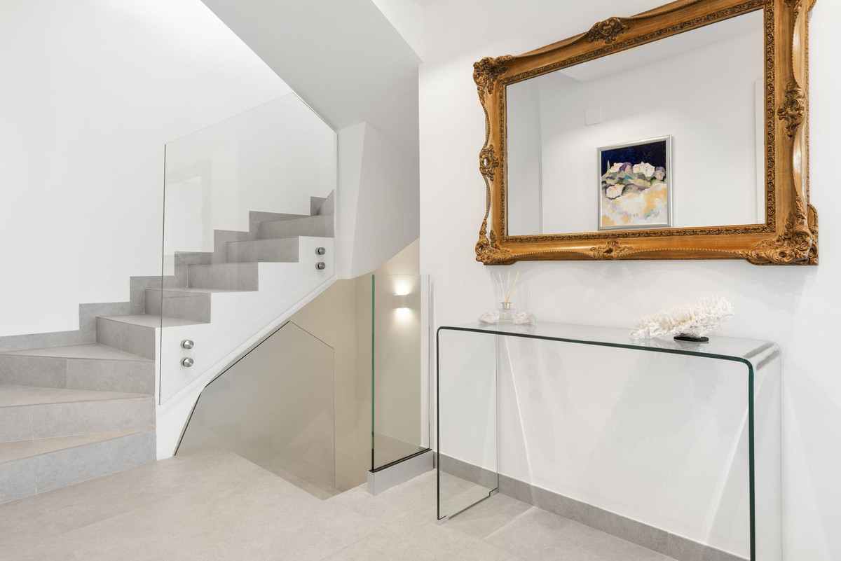 The second floor is an entertainer's dream! The expansive, open-plan kitchen, dining, and living area is the heart of the home. The high-end kitchen boasts top-tier NEFF appliances known for their elegance, quality, and functionality. Floor-to-ceiling glass doors in the living room flood the space with natural light and lead out to a large terrace, blending indoor and outdoor living seamlessly. The terrace features automatic awnings and showcases yet another breathtaking view. Behind the living area, you'll find a hidden gem: a large private patio, beautifully landscaped around a mature olive tree, offering a peaceful retreat.