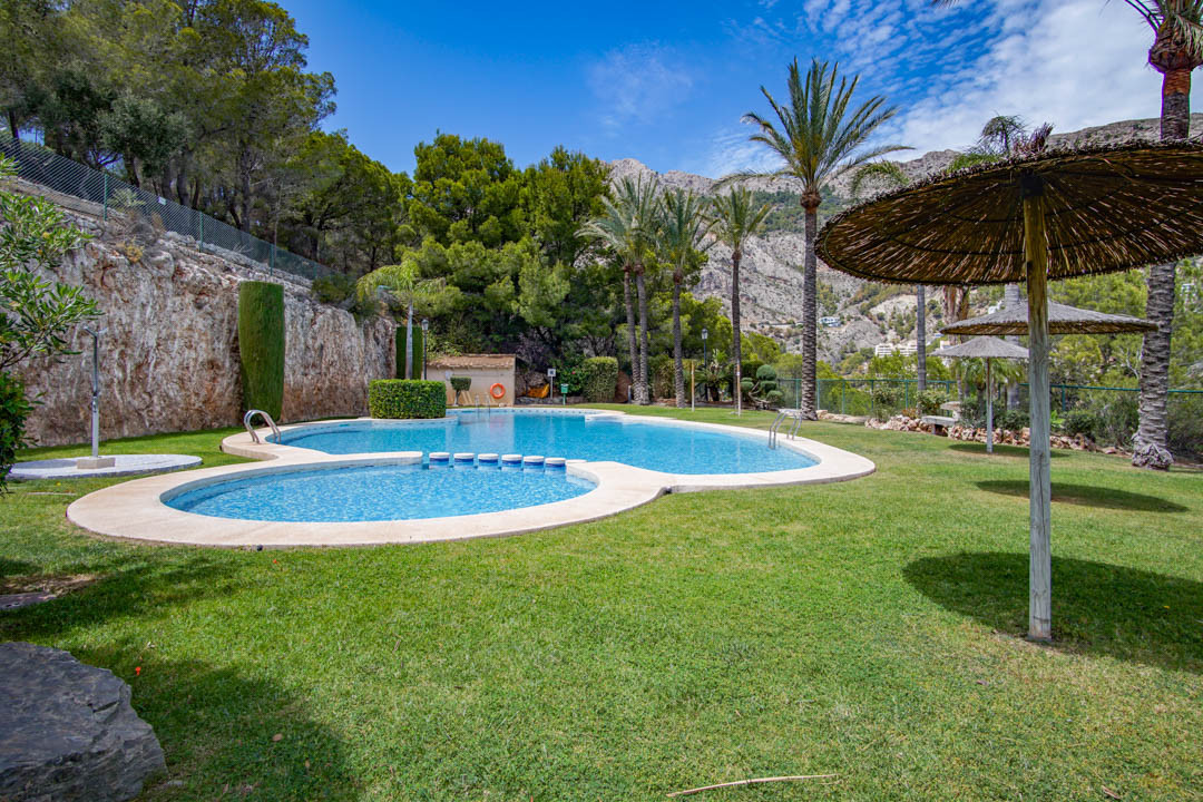 For golfers; at 3,5km from the golf club ¨Don Cayo Golf Club ¨. A little further down you will find the super cozy Old Altea (Altea La Vieja) with all its restaurants, stores and banks. This cozy house is located in a guarded, gated urbanization. Given the inclination of the plot you will find the carport and entrance at the top, through the stairs you enter the living room where immediately the coziness is striking the beautiful view. Next is the terrace with dining table and sun loungers. On the same level is the kitchen with pantry and inner terrace. Stairs lead down to the sleeping area with 2 bedrooms, one of which has its own bathroom and terrace, and a bathroom for the second bedroom. There are also beautifully landscaped communal gardens and a large swimming pool, again with sea views and views of Altea Hills. A great opportunity for someone looking for a nice and affordable vacation home in an expensive area!