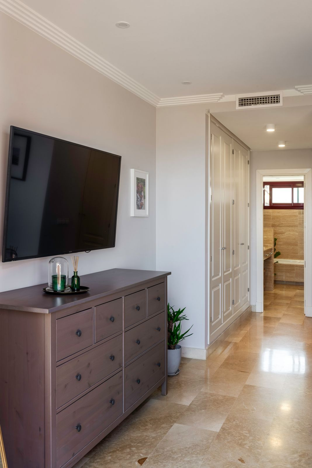 On the first floor there is a master bedroom with ensuite bathroom and large dressing room, two bedrooms with a shared bathroom and a spacious terrace with panoramic sea and mountain views. Each bathroom is equipped with a shower and a bathtub. Two bedrooms have built-in wardrobes with plenty room of storage space.