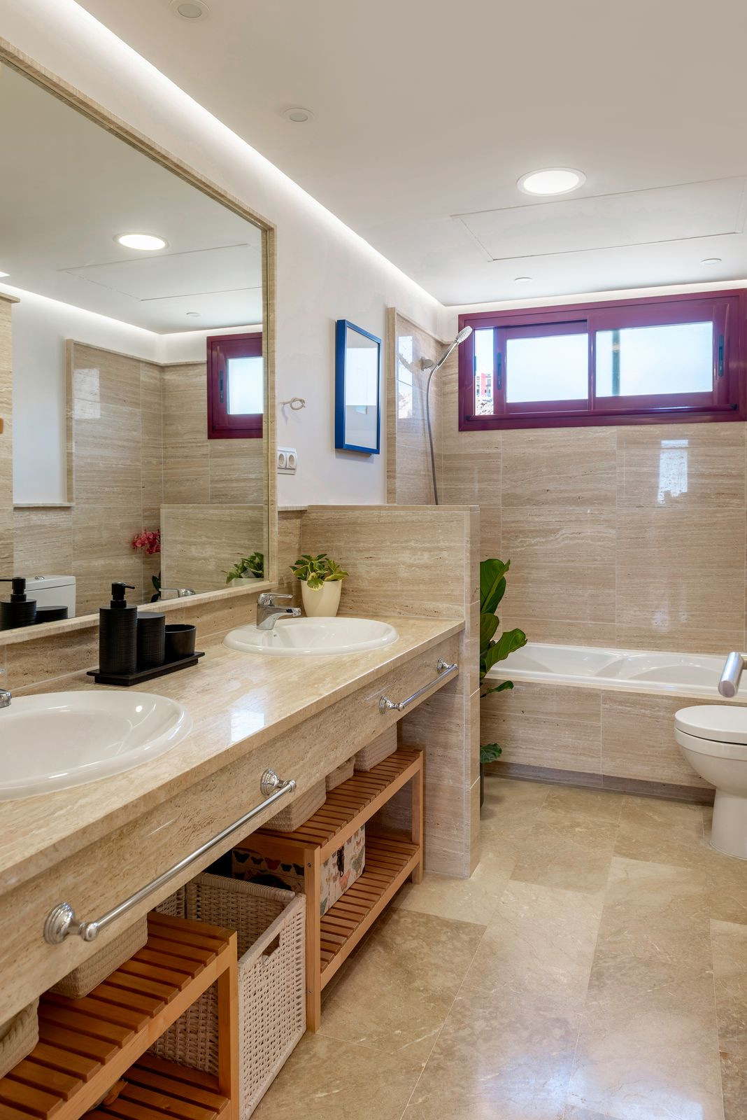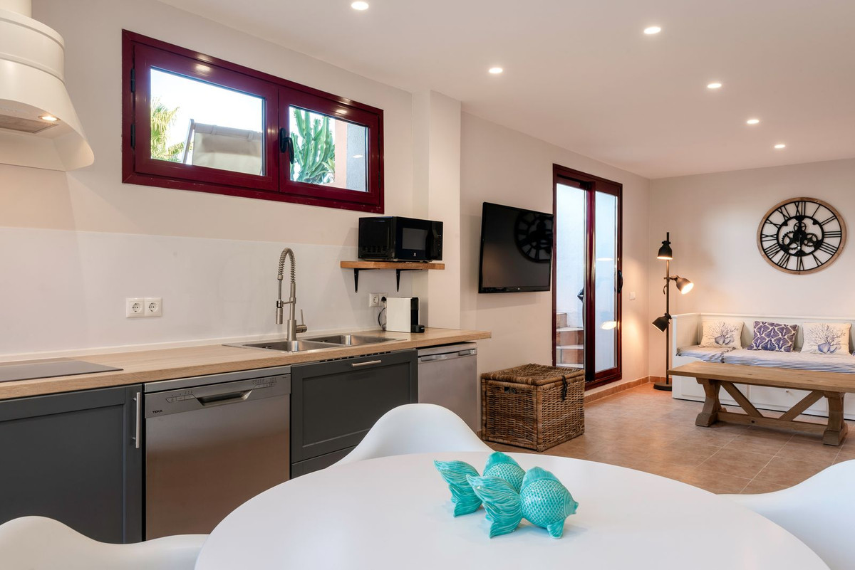 On the entrance level there is a spacious, living room with fireplace, open plan kitchen and dining area, guest toilet and a large terrace with spectacular sea and La Concha mountain views. The living room is very well lit, with panoramic terrace windows and an additional window at the dining table.