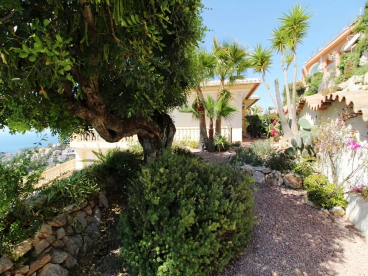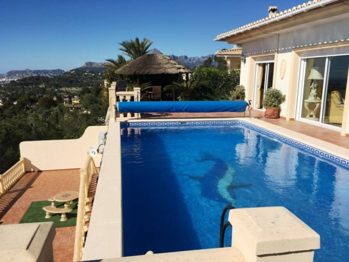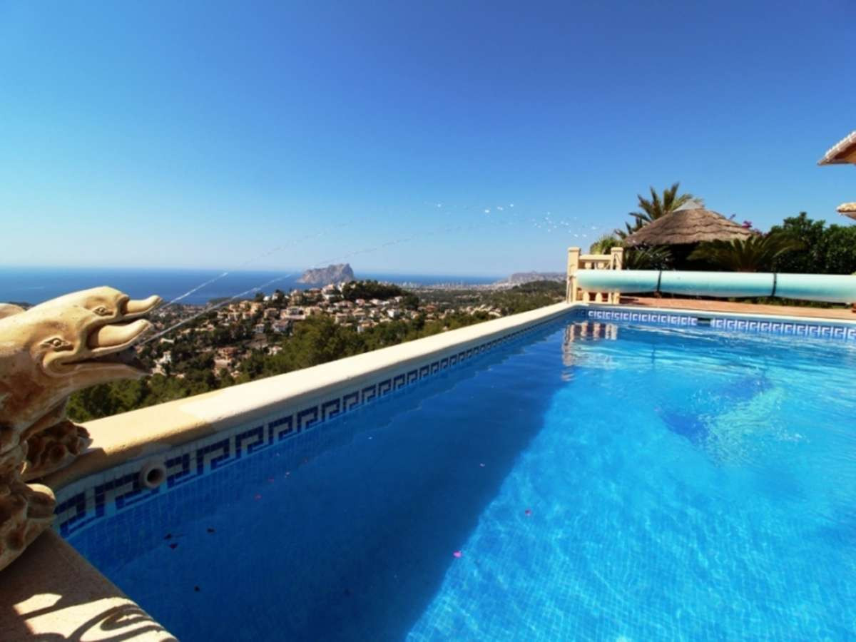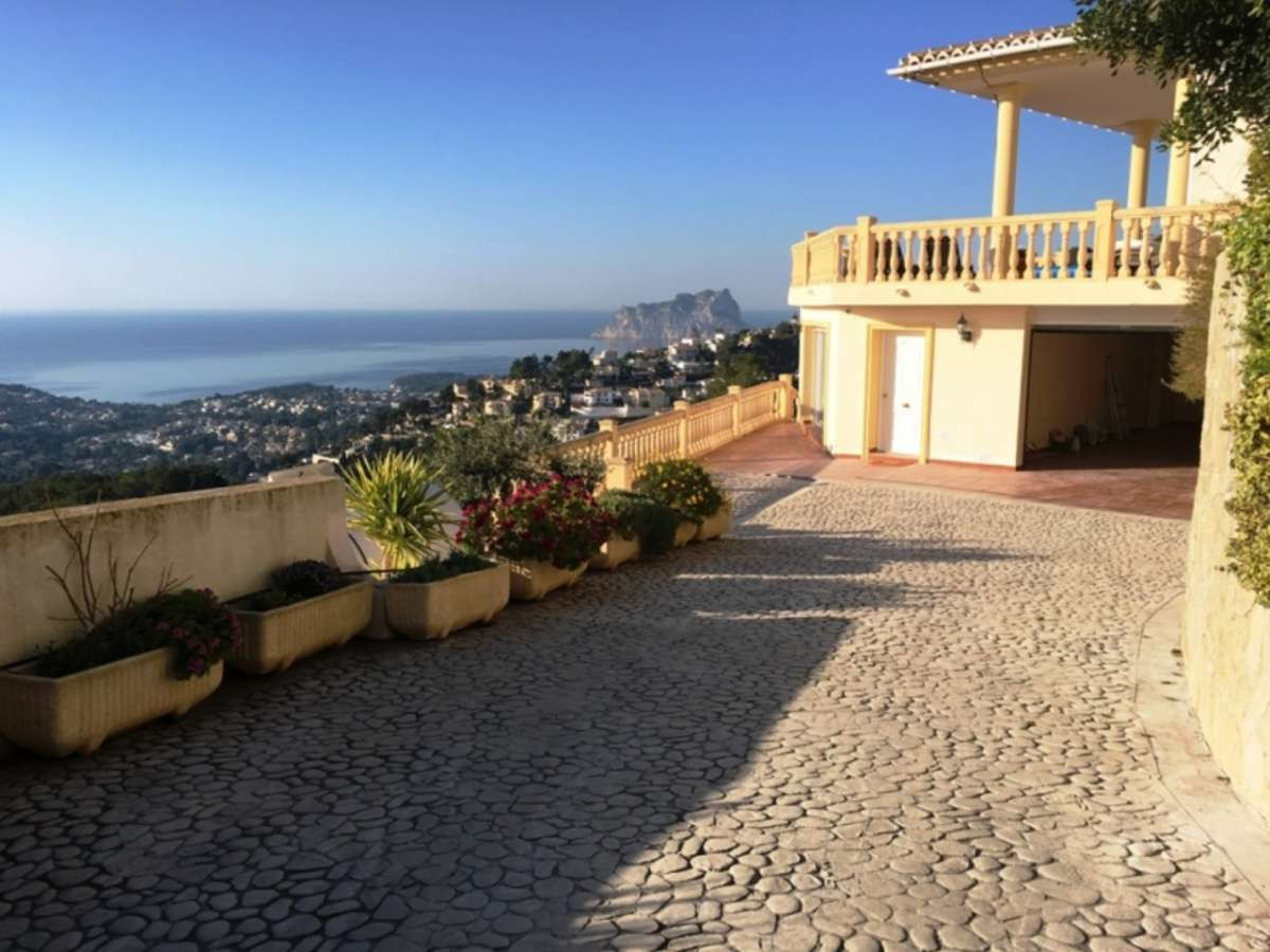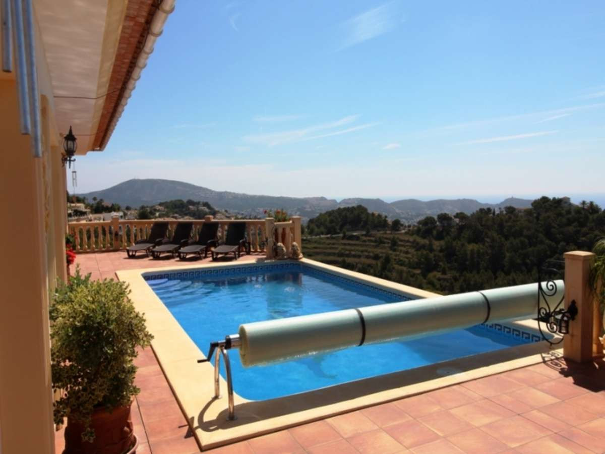 Panoramic Villa with stunning sea views for sale in Benimeit, 4.5km drive to the town of Teulada and 5km to the Blue flag sandy beaches of Moraira.Built-in 2004 comprises of one main level with spectacular views of the sea and Penon de Ifach. Entry via a driveway leading to the double garage. On the upper lane a Pedestrian gate to the main door or via the internal staircase from the garage. Entry via the main door into the spacious open plan Lounge and Dining area, with large sliding doors with views over the pool to the sea.Open plan kitchen with central Island and granite worktops, fully fitted with appliances, double oven and sliding doors to the pool terrace. Underfloor Central heating on this level together with Air conditioning in all bedrooms. The double glazing windows have electric blinds.Doors from the Kitchen and Lounge flow onto the newly laid terrace with non-slip natural stone tiles, designed to collect any surface water and diverts to a large water deposit and diverted and used in the garden via a timed irrigation system. Master bedroom with His & Hers fitted wardrobes in the walk-in closet area, sliding doors flowing out to the terrace. En-suite bathroom with corner bath and walk-in shower, double vanity unit, WC. Further two bedrooms with fitted wardrobes sharing a shower room.Internal staircase to lower level with an independent 1 bedroom, sea view guest apartment with en-suite shower room, full kitchen access from the garage or independent front door.Outside on the 785m2 plot, the terrace has an open Naya, 8 x 4m2 infinity swimming pool, Portable BBQ area and a shady Gazebo. Established and manageable garden with flower, Mediterranean plants and fruit trees. There is also a lower terrace leading from the guest apartment.Extras include a high-tech video surveillance system with cameras that can be accessed via your mobile device anywhere in the world. Wall mounted solar heating system for hot water and heating the pool, New water pressure of 4 ¼ bar, new costs effective heating system, cutting yearly flue bills. Wifi throughout the property.