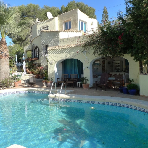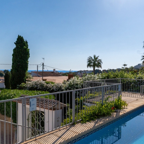 This pretty villa offers amazing views of Javea, its bay, and the sea. It has 3 bedrooms, each with its own bathroom.The villa has two floors, and each one has a big covered terrace where you can enjoy the beautiful views.When you arrive at the top floor, you'll find a nice open space with a kitchen, a dining area, a bedroom, and a bathroom. Downstairs, there are two more bedrooms, each with its own bathroom, and a toilet for guests.Outside, there's a terrace with a private pool and a garden with some lovely olive trees and cozy spots to sit.The renovation of this property is soon to be finished. In addition you have the option to buy it furnished with all new furniture.