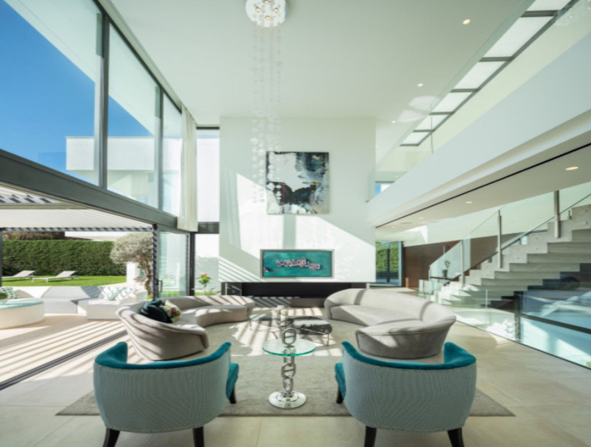 This contemporary villa provides the ultimate in beach side luxury living. Located in the beautiful beachside resort of Puerto Banus, 200 meters walking distance to the beach, close to shops and nightlife of Puerto Banus and short driving distance from Marbella centre and San Pedro. Designed across 3 floors, all accessible through the private elevator, the property offers 7 bedrooms and 7 bathrooms each with an outdoor terrace. Entrance level boasts of a large airy open plan living with double height ceilings. Welcoming exteriors include a manicured garden which surrounds the 54m2 salt water heated pool, cosy lounge areas, an outdoor dining area completed with its own outdoor kitchen and BBQ area for al fresco dining. On the first floor you will find 3 en-suite bedrooms and a hanging gallery overlooking the impressive lounge area. The generous master suite is completed with a walk-in shower, stand alone bath and an expansive walk-in wardrobe. A large outdoor sun terrace overlooks the pool and garden with access to the roof terrace. An expansive area with 3 separate terraces, giving you even more options for sunbathing and dining, while enjoying the breathtaking Sea and Mountain views. The basement has been converted into the perfect relaxation area, equipped with a cinema room and a games lounge.