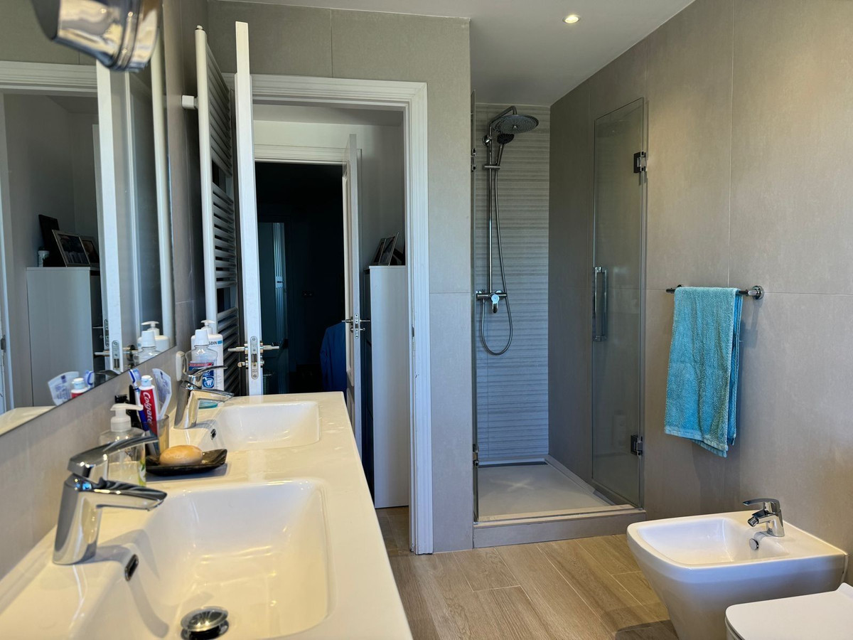 The townhouse is spread over three floors, in addition to a rooftop terrace, all finished to a high standard. On the ground level, you'll find a generously sized living and dining area that opens onto a spacious porch and a private garden, a fully equipped kitchen, and a guest bathroom. The first floor hosts the master suite, complete with an en suite bathroom and a private terrace, as well as two additional bedrooms, each with their own balcony, sharing a bathroom. The rooftop terrace is a real highlight, offering a built-in barbecue and breathtaking sea views.