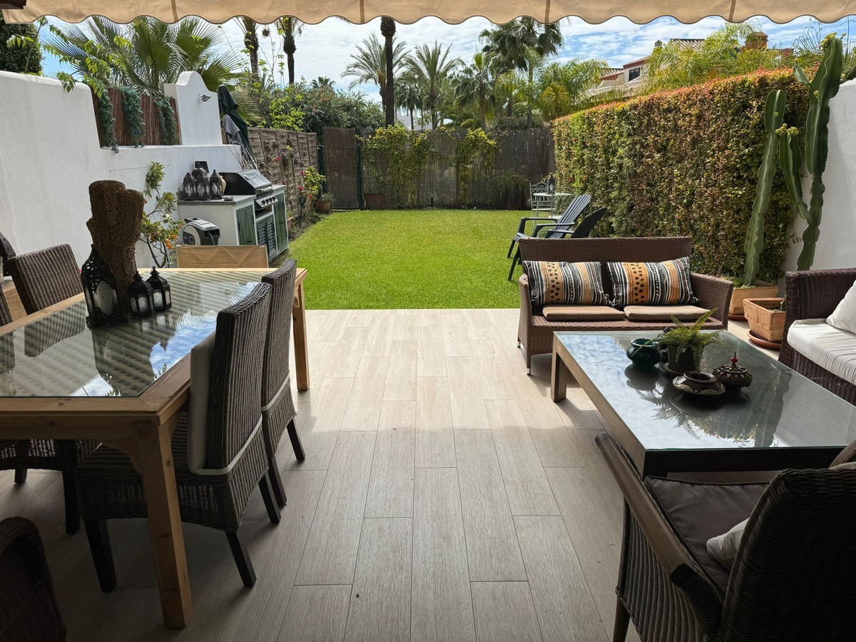 This south-facing townhouse is located in the prestigious Golden Mile area of Marbella, a stone's throw away from the luxurious Puente Romano and Marbella Club hotels, along with their exclusive beach clubs. It's also conveniently close to the heart of Marbella and the chic Puerto Banus. Set within a securely gated community that merges modern design with classic Mediterranean flair, this property is surrounded by beautiful, lush gardens featuring palm trees and offers access to two swimming pools.