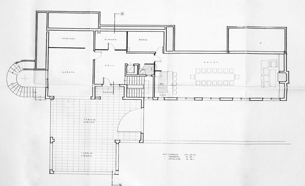 The ground floor (192 m2) consists of a living room of 75 m2 with fireplace and kitchen with bar, a toilet, wine cellar, storeroom, double garage, storage room, lift, large covered terrace of 70 m2 and an adjoining uncovered terrace of 30 m2. It is the main entrance of the house.