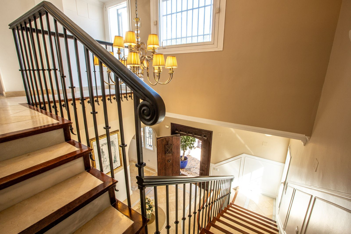 This stunning southwest-facing, two-story villa with a distinctive tower room is situated on an elevated corner plot in Sotogrande's prestigious B Zone. Offering exceptional privacy, abundant natural light, and captivating views of the Sierra Bermeja mountains, this home is designed for luxurious living.