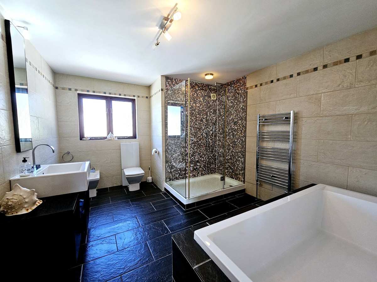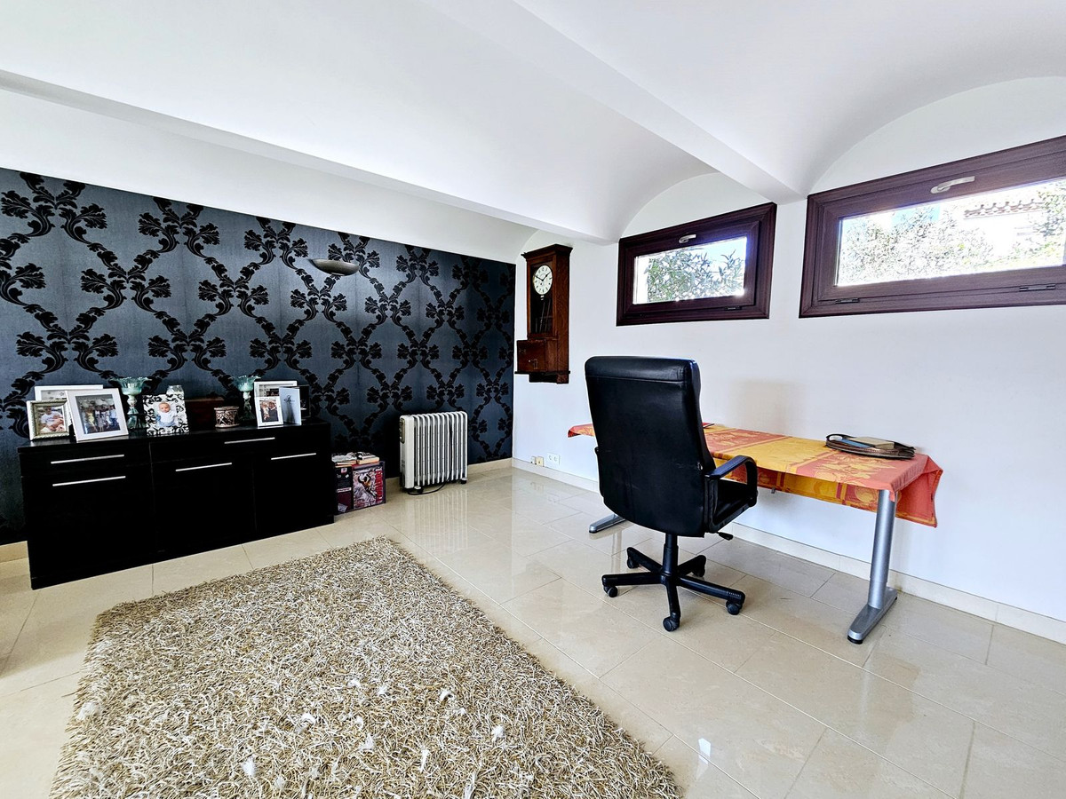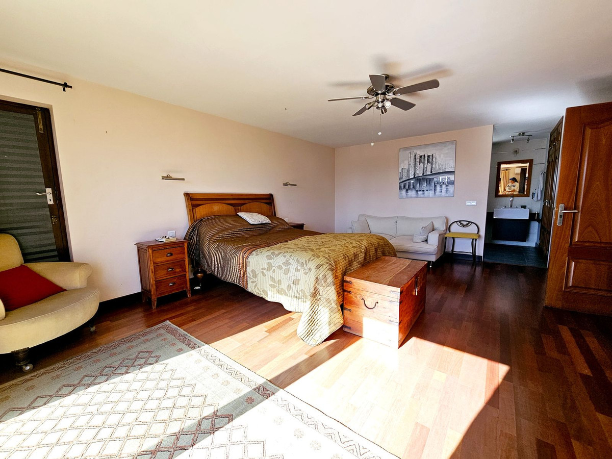 On entering the villa you are greeted by a beautiful Andalucian wooden front door that opens up into an entrance hall. To the right you will find a spacious and bright living room, office, one large bedroom and a full bathroom. To the left there is a second sitting room/TV area, a fully equipped, open plan kitchen and dining area which leads straight out to the covered and uncovered terraces and garden. Upstairs you will find the large master bedroom with ensuite bathroom, private terrace and private access to the gardens. There are three further bedrooms upstairs, one with a private terrace. All are large and share an oversized bathroom with bath tub and shower. There is an undeveloped space between two of the bedrooms that could easily be adapted into a Jack and Jill bathroom if a further bathroom is needed. All bedrooms have hot and cold air conditioning,