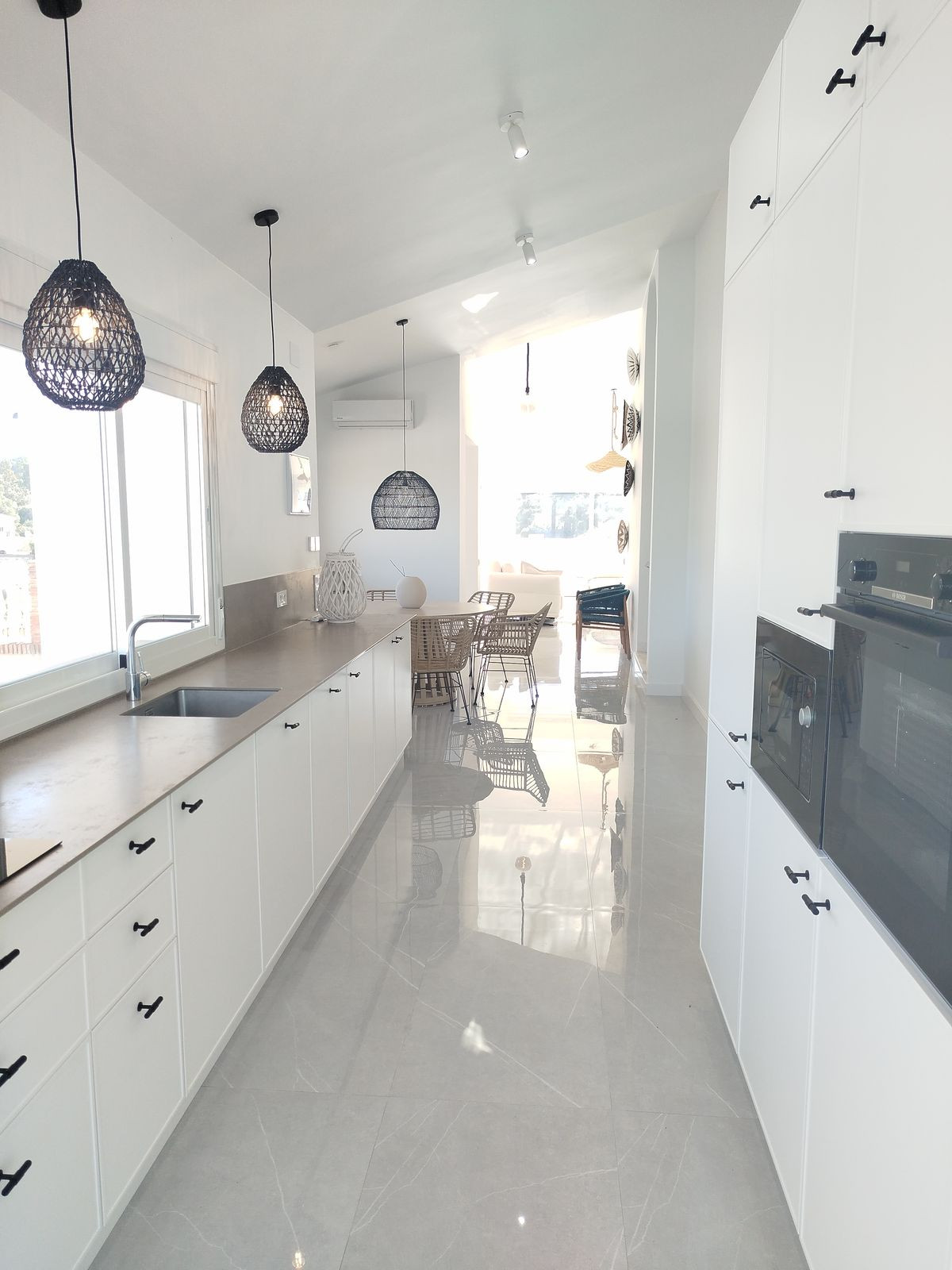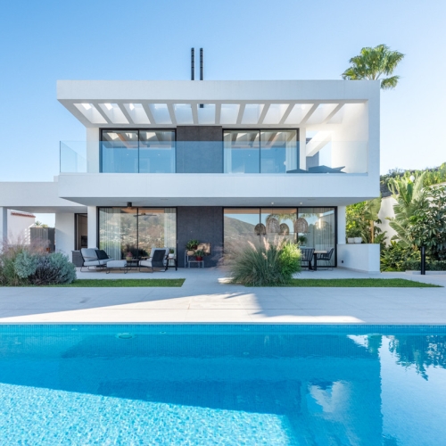 This immaculate 3-bedroom villa with 3 ensuite bathrooms has recently been totally renovated to a high standard. It is set in an elevated position in Cerros de Aguila with unparalled panoramic sea and mountain views. You enter via a long driveway with private parking plus a covered garage for 2 cars and with a good-sized storeroom. There is a gated entrance to the one level villa with an open plan living/dining room and kitchen diner both with access to large terraces with panoramic sea views and to the landscaped gardens with an infinity pool. There are 2 guest bedrooms with ensuites with access to the back garden and terraces, a guest toilet, and a large master bedroom with a feature bath, washbasin and toilet with panoramic views to the sea. The property has underfloor heating in most rooms with electric blinds and hot and cold air conditioning. The property is all fenced and alarmed with terraced gardens with a selection of fruit and palm trees. There is also a roof solarium with panoramic 360-degree views of the mountains and the sea. The property is within easy access to Fuengirola and Mijas, bars, restaurants, beach and the new Mijas park. You also have the well-placed community pool, gardens, sport facilities, bars and shops of the local community of Cerros de Aguila.
