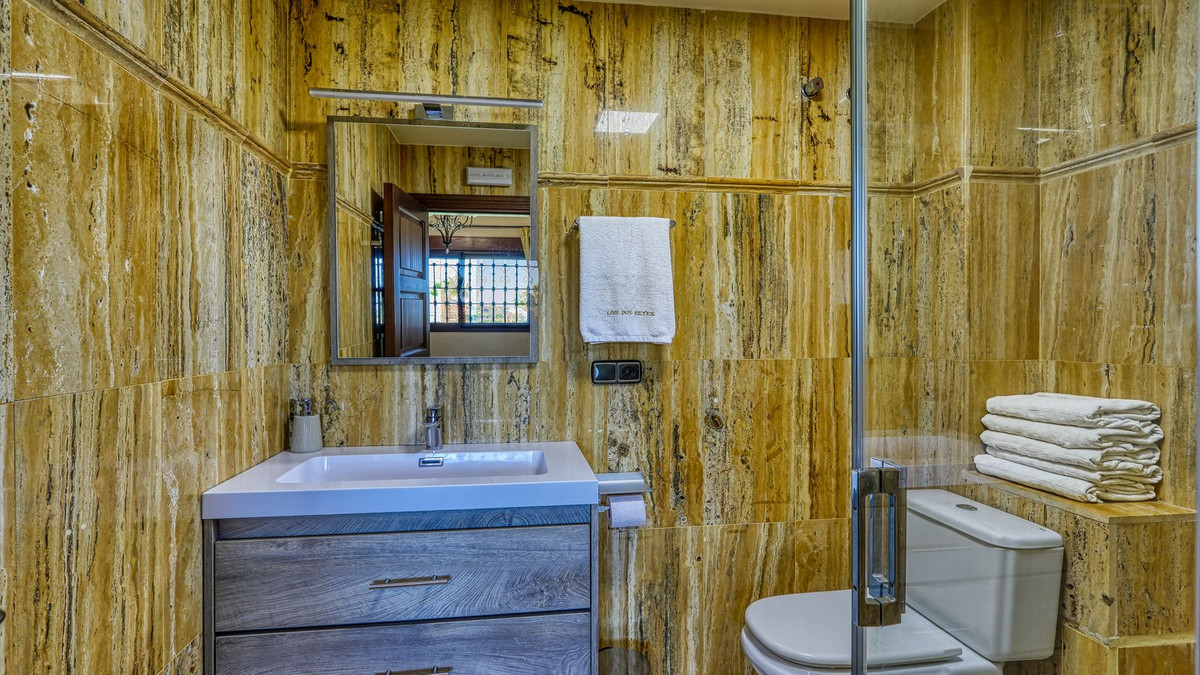 On the pool level, a separate living area offers a private oasis with its own comfortable living room, covered porch with a convenient WC, fully equipped kitchen, additional bathroom, and three bedrooms. This floor also includes ample storage with a dedicated cold room, a boiler room, and additional storage space, ideal for seamless living.