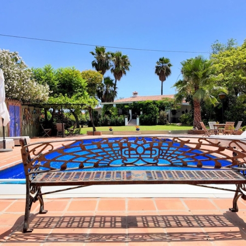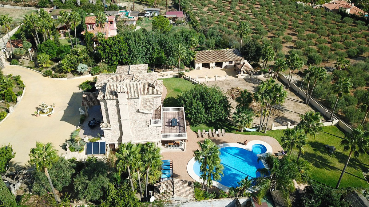 Discover this one-of-a-kind luxurious country estate —a perfect blend of modern elegance and rustic charm, situated just 20 minutes from Málaga Airport and near the lively town of Alhaurín de la Torre. The commanding mansion is beautifully encased in local stone, carefully reclaimed and restored, which imbues the property with unique character and charm. Standout features include the main hall's stately stone fireplace and a hand-carved coat of arms, all framed by impressive outer columns imported from India.