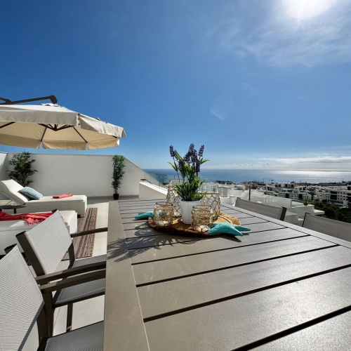 REDUCED - Stunning 2 bed duplex Penthouse only 100m to beach, shops & restaurants, with breathtaking 180º Mediterranean sea views. Set in exclusive El Higueron luxury Sports / Spa community with own beach Club.