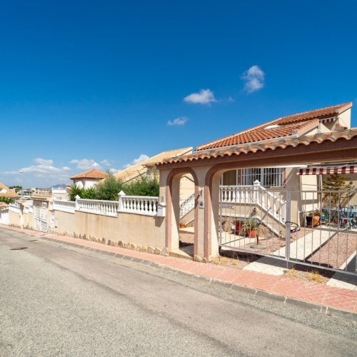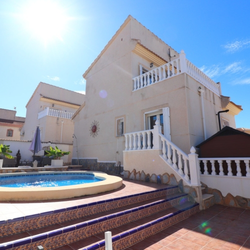 This beautiful detached 3-bedroom, 3-bathroom home is located in Benijófar, steps away from all essential services and the new Benisol shopping center. The spacious interior includes a large living room and an open-plan, fully-equipped kitchen with an oven, microwave, dishwasher, range hood, and refrigerator.The property offers per-installation for air conditioning and built-in wardrobes in every bedroom. On the ground floor, you'll find two of the three bedrooms, including one with an en-suite bathroom, as well as an additional shared bathroom. The third bedroom, also en-suite, is located on the first floor and is accessible by an external staircase, providing an independent entrance. This upstairs suite features a dual-sink bathroom and opens onto a vast 70 m² solarium with stunning mountain views.Outside, enjoy the private swimming pool, parking on the property, and a storage area cleverly designed under the stairs. This home is set in one of Benijófar's most popular areas, blending convenience, privacy, and style.