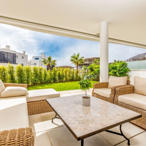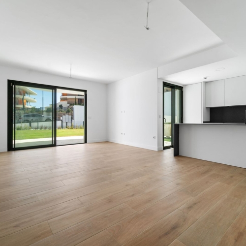 The living room opens onto a large terrace with a private garden, ideal for relaxing and outdoor dining.