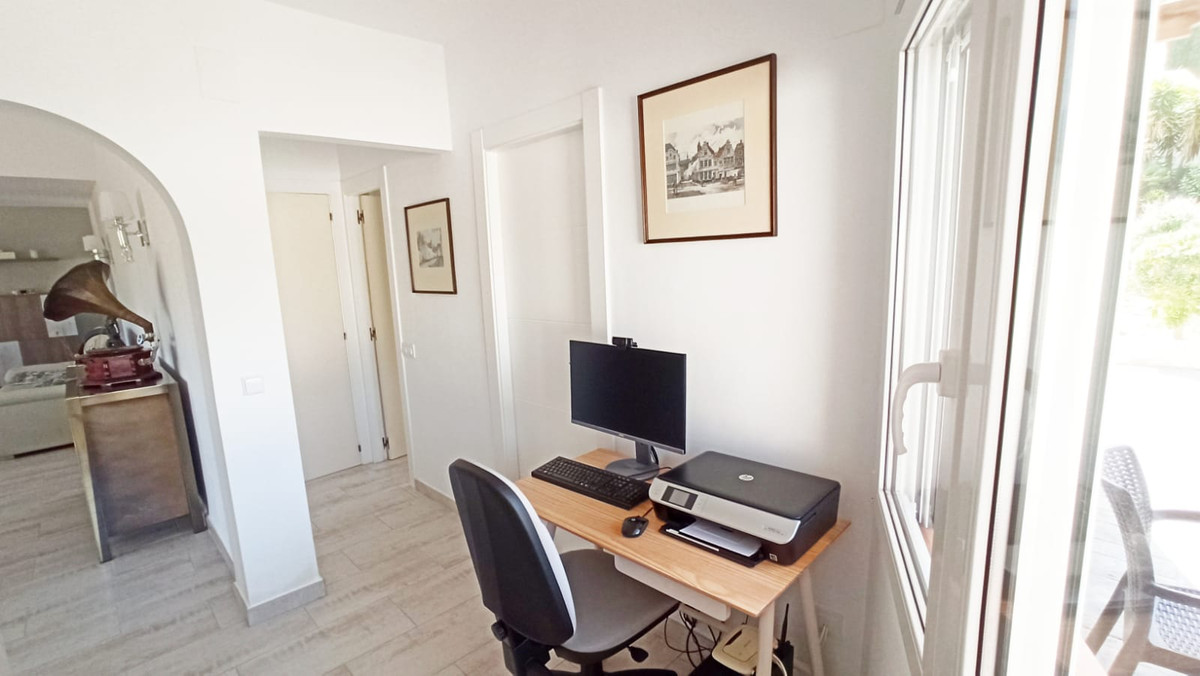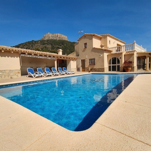Cometa III Calpe - Villa with large plot and tennis court for sale. At Cometa III in Calpe, we present this beautiful villa on a plot of 5934 m², with tennis court, swimming pool, and a beautiful garden. The villa is divided into a main house and a guest house. Both the main and guest houses have a living room with kitchen. The main house has 3 bedrooms and 3 bathrooms. The guest house has 2 bedrooms and 2 bathrooms. In addition, the main house has a beautiful garden room and a covered terrace, with views of La Olta, Colina del Sol and Empedrola. The villa, tennis court and huge gardens are in excellent condition. The villa also has a garage for 1 car, and a carport for 2 cars. If needed, there is enough space to park a dozen vehicles in this property.