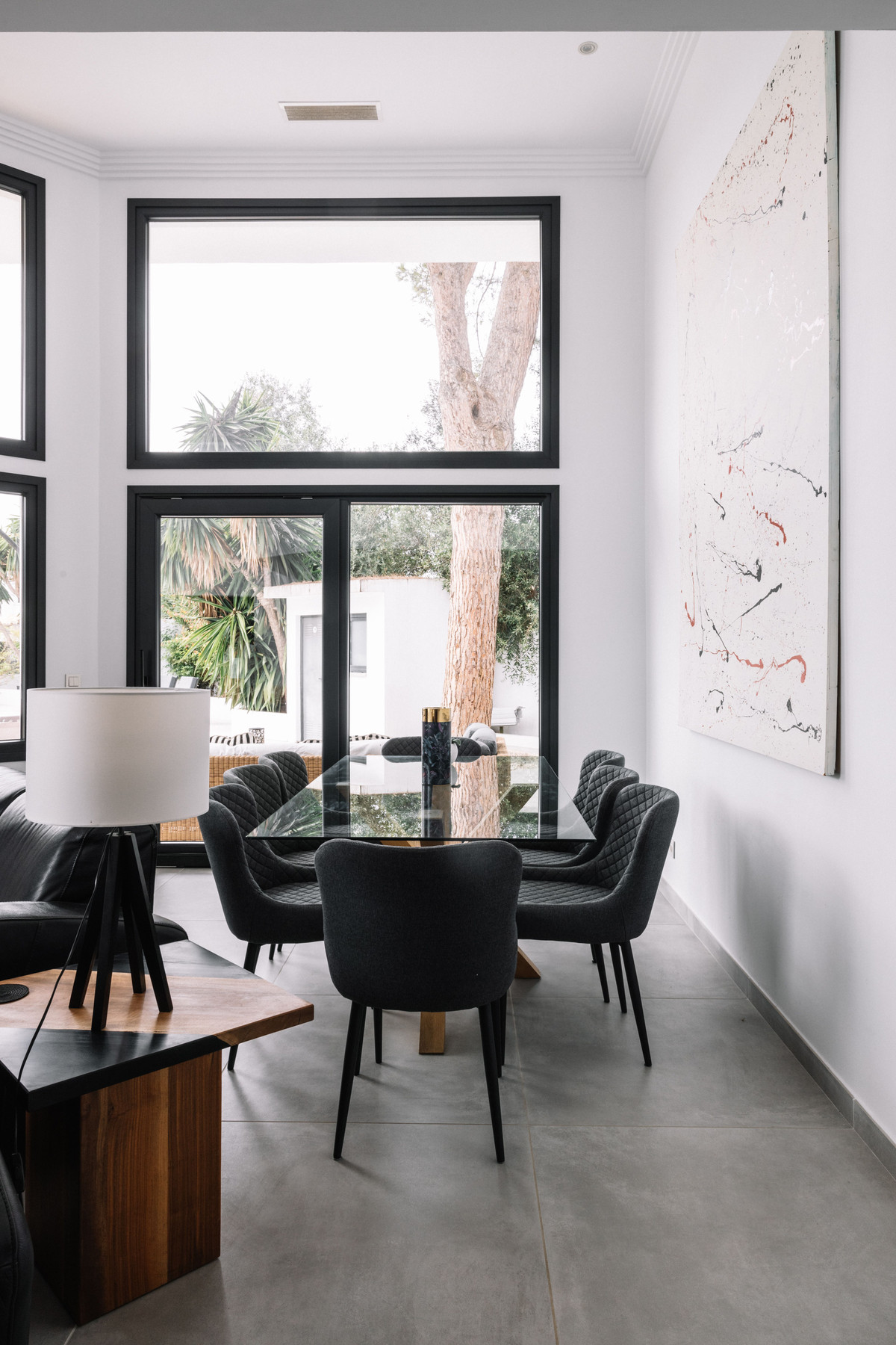 Meticulously refurbished with uncompromising attention to detail, the villa exudes timeless elegance and modern functionality. The main floor unveils a luminous, double-height living room with soaring floor-to-ceiling windows, seamlessly connecting to a partially covered terrace. Adjacent lies a fully equipped kitchen with a charming breakfast nook, accompanied by convenient access to the laundry and storage rooms. This level accommodates three thoughtfully designed bedrooms—two sharing a bathroom and one with an ensuite.