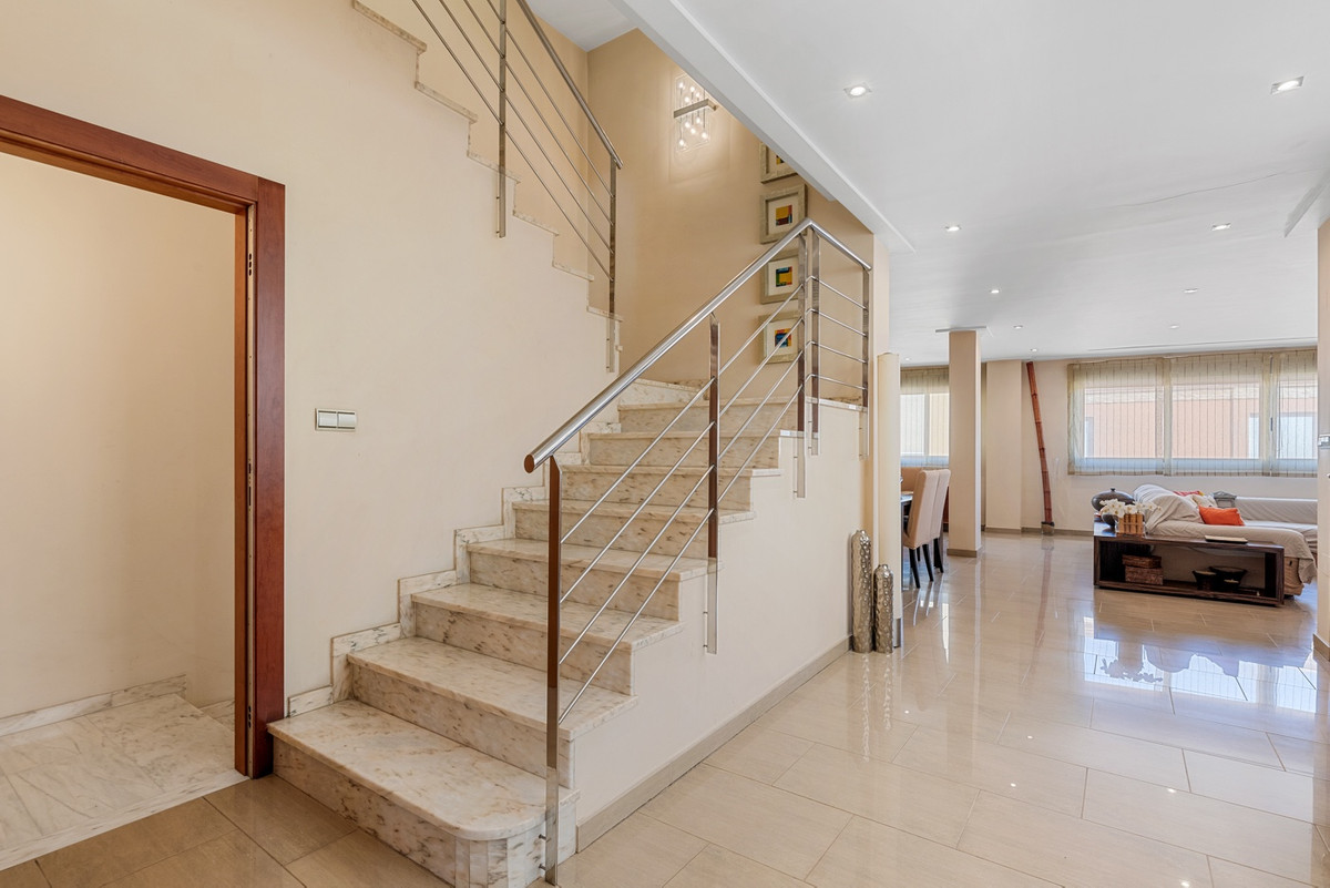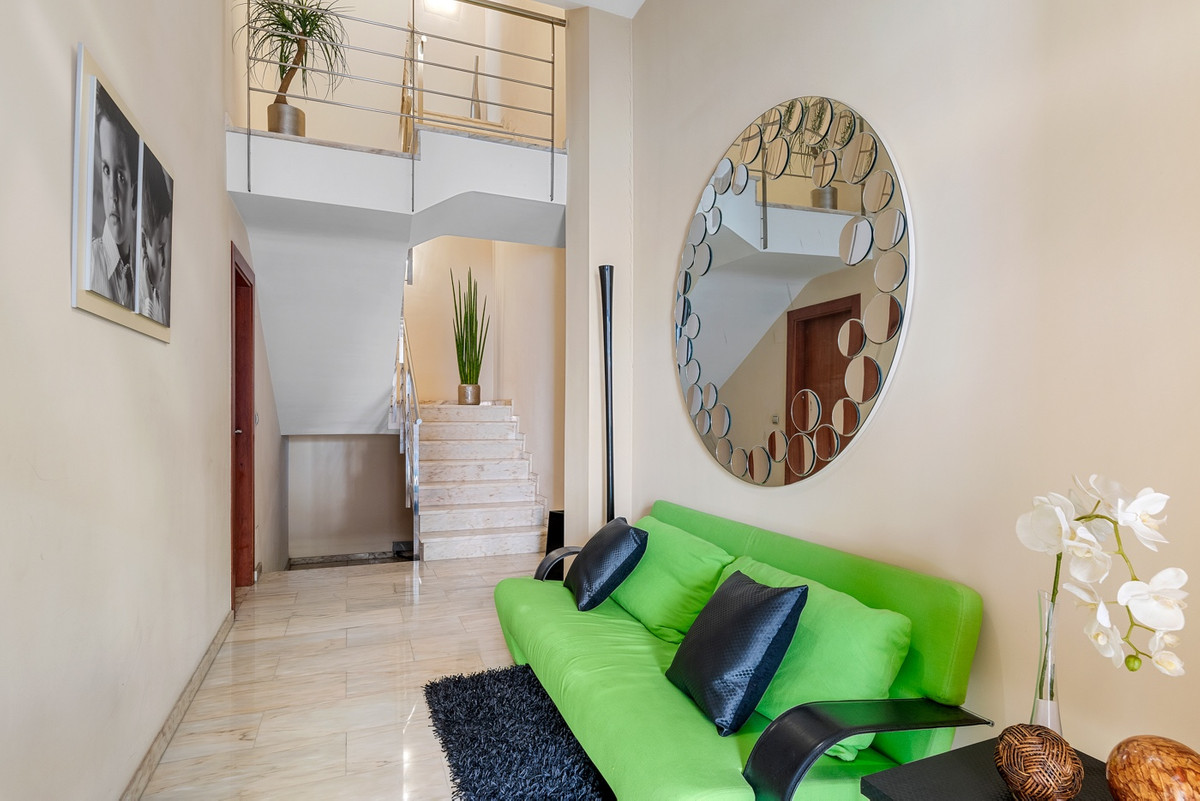 The house spans three floors, offering 344 m² of living space. On the ground floor, you'll find a spacious garage that can hold up to four vehicles, complete with a loft area. The main entrance leads into the house, where the first floor opens up to a large kitchen. This independent kitchen has plenty of storage space and granite countertops, and it is equipped with modern appliances. There is also a pantry and access to a charming rear patio, which features a laundry area, barbecue, and additional storage. The open-plan living and dining area is bright and spacious, providing an ideal setting for family time or entertaining guests. A guest bathroom is also located on this floor.