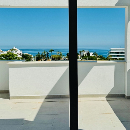BRIGHT AND TRANQUIL PENTHOUSE WITH SEA VIEWS ON THE COSTA DEL SOL. This charming penthouse is located in an excellent area of Estepona, just 700 meters from the beach, allowing you to enjoy the sea and Mediterranean climate. Additionally, it is ideally situated, only 20 minutes from Marbella and 50 minutes from the airport, making it easy to access other areas of interest. With a south-facing orientation, this property takes full advantage of natural light throughout the day. From its 56 m² terrace, you can relax while enjoying stunning sea views. The property is in excellent condition, with high-quality finishes that ensure a comfortable and functional environment. The penthouse is equipped with air conditioning to maintain a pleasant temperature at all times, and the garage is included in the price. Residents of the complex have access to a communal garden and swimming pool, where they can enjoy a relaxing environment. Located near restaurants, shops, and golf courses, this property is ideal for families and those seeking a peaceful home, well-connected and with all necessary services within reach. Built in 2021, this property is an excellent option for those looking to live on the Costa del Sol.