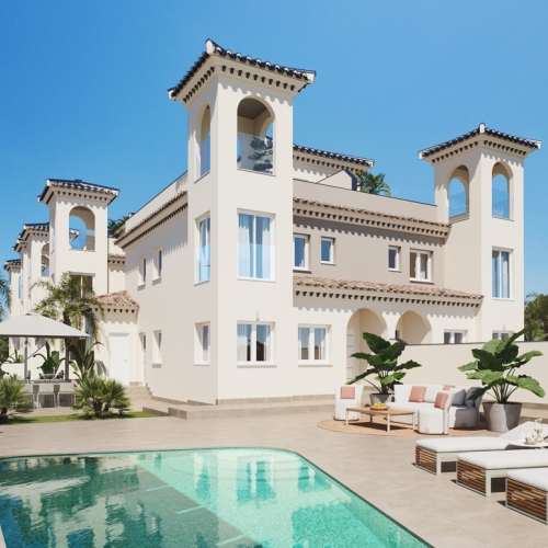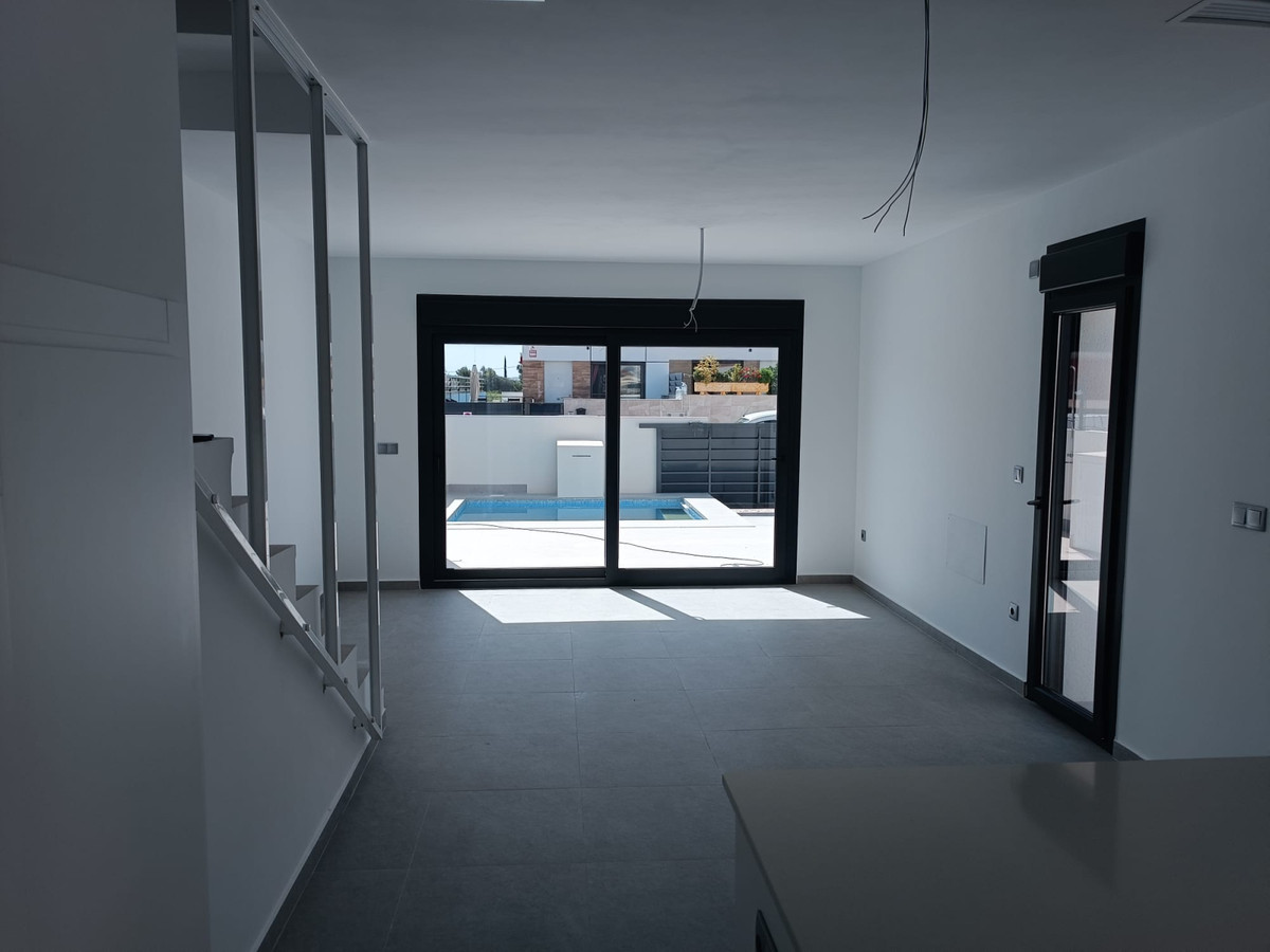 New build semi detached villas in the new part of Daya Nueva. Just a few minutes walk to the centre of the town. 3 bedrooms, 2 bathrooms, private splash pool and terrace of 18m2 with featured water wall. Dining / living room with open plan kitchen, bedroom with fitted wardrobes, en suite bathroom on the ground floor and on the first floor 2 bedrooms, fitted wardrobes and bathroom.