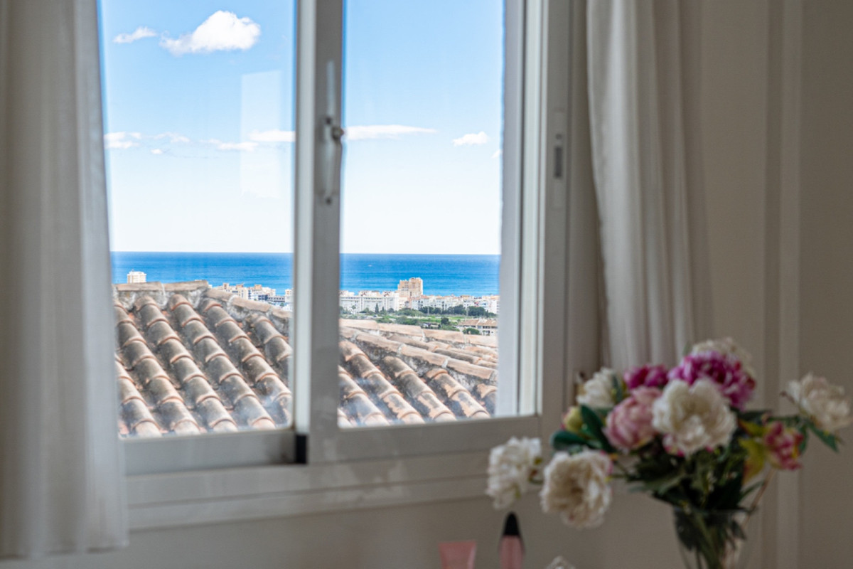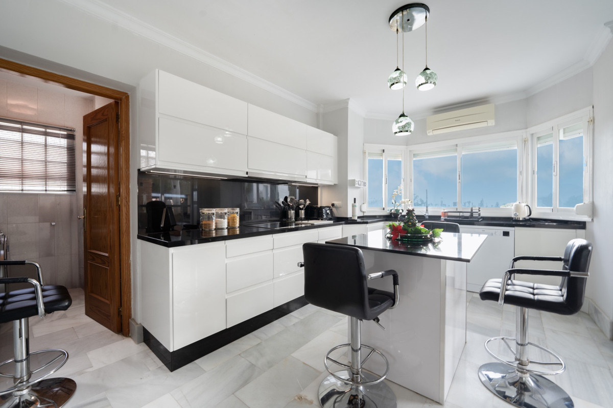 Villa Christine is a spacious south-facing family home set on a generous 900 m² plot in Mijas. The property offers panoramic views of the Mediterranean Sea, the surrounding mountains, and beautifully maintained gardens. Inside, the grand hallway and marble staircase set the tone for this elegant residence. The modern kitchen features sleek black-and-white finishes, an island unit, and a bay window with stunning sea views.