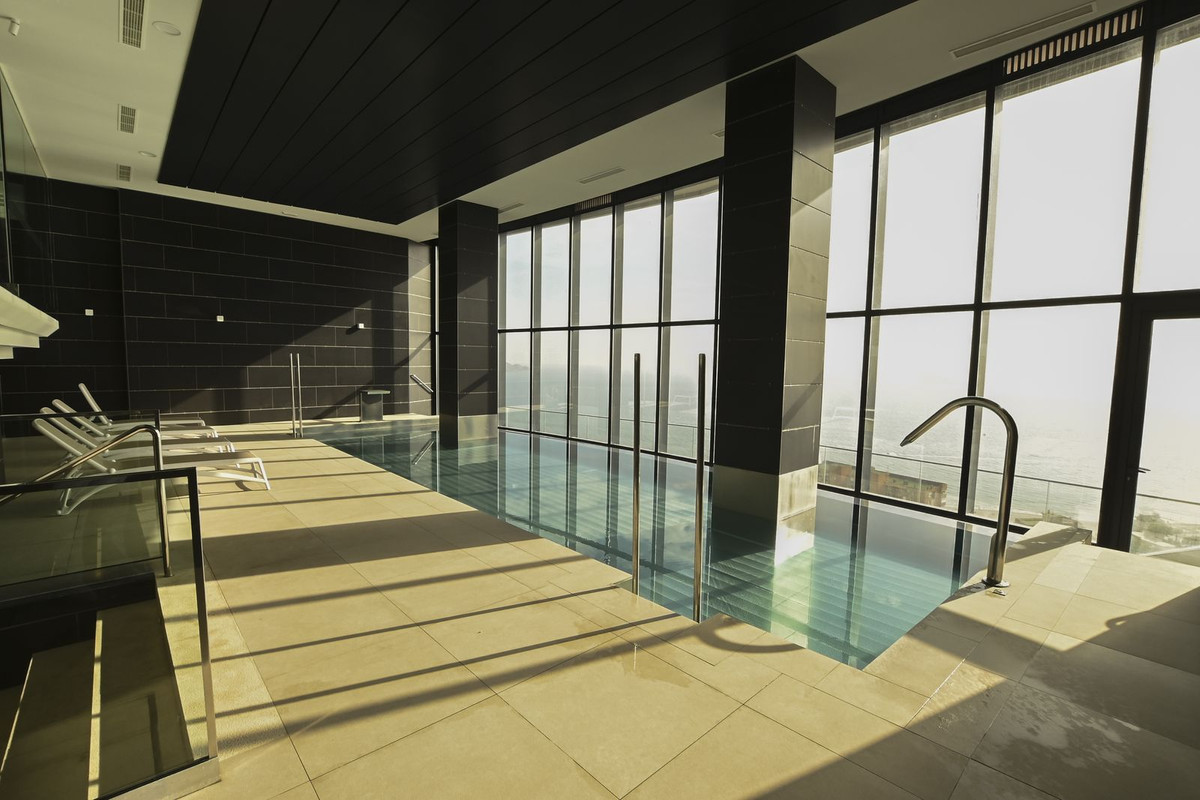 Heated swimming pool and a modern gym with panoramic sea views on the 26th floor of the block.