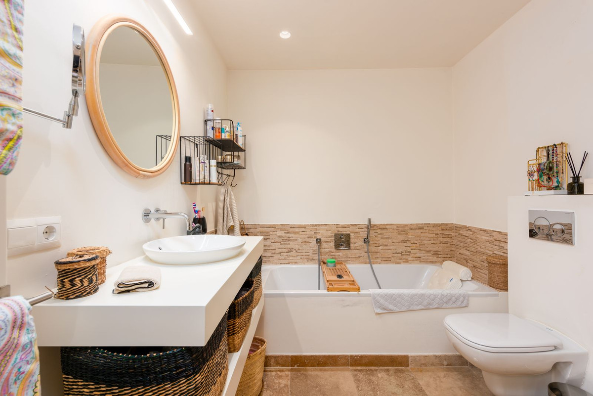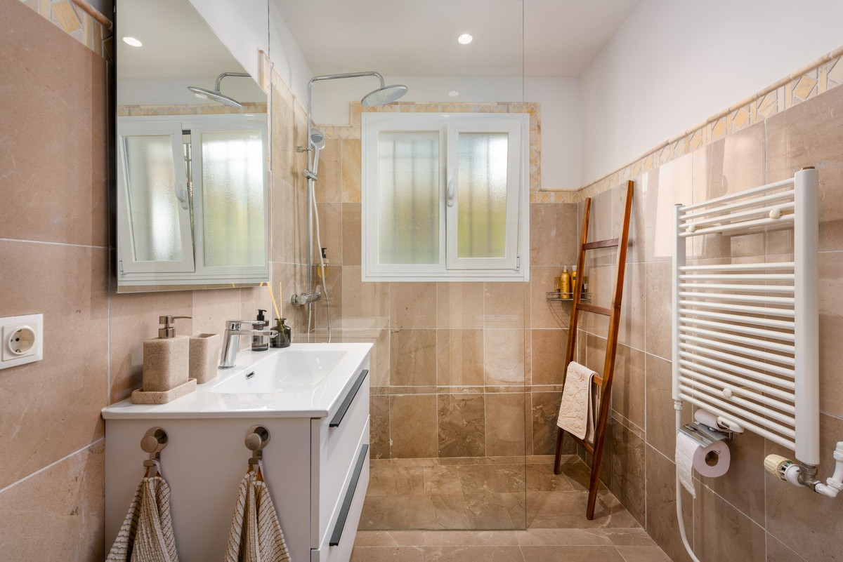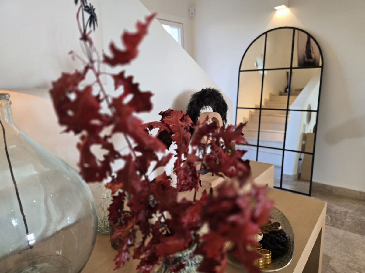 The villa spans two levels, plus a large basement and an attic with potential for an additional bedroom or office space. Upon entering through an elegant conservatory patio, you are welcomed by an impressive solid oak wood Arabic-style door. The spacious and cozy living room with a fireplace flows into a large dining area, while the brand-new, fully equipped luxury kitchen opens onto a charming courtyard, perfect for breakfast. Adjacent to the kitchen is a large laundry and storage room. The rear terrace offers breathtaking panorama to the mountains and lush country side.