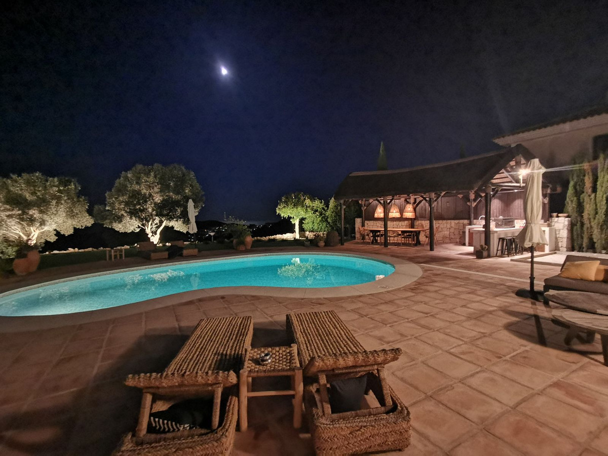 The basement level accessible via inner staircase and also separate entrance, accommodates a comfortable second sitting room of almost 50m2, and can be used as home cinema, office, fitness room, game room or guest/staff accommodation. The villa's outdoor areas are equally impressive, featuring a beautiful heated swimming pool, a tropical gazebo perfect for al fresco dining, and outstanding sea views. Additionally, there is a pétanque court and a variety of fruit trees, complemented by a beautifully landscaped stone garden with olive and cork oak trees.